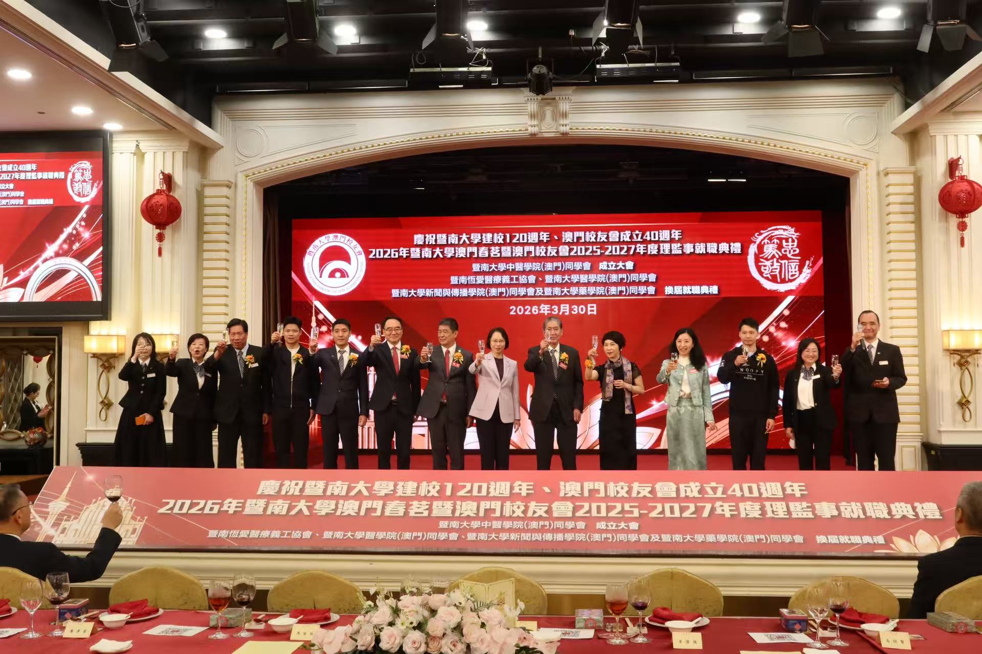 【即時新聞】為慶祝暨南大學建校120周年及澳門校友會成立40周年,"2026年暨南大學澳門春茗暨澳門校友會2025-2027年度理監事就職典禮"今晚舉行。會長馬志成表示,新一屆理監事將強化與母校聯動,關注青年成長,持續辦好品牌論壇與社區義工服務,以實際行動回饋社會。暨南大學校長邢鋒勉勵校友會續寫愛國愛澳愛校新篇章,並透露將啟動暨南大學澳門高等研究院建設,助力澳門融入大灣區。