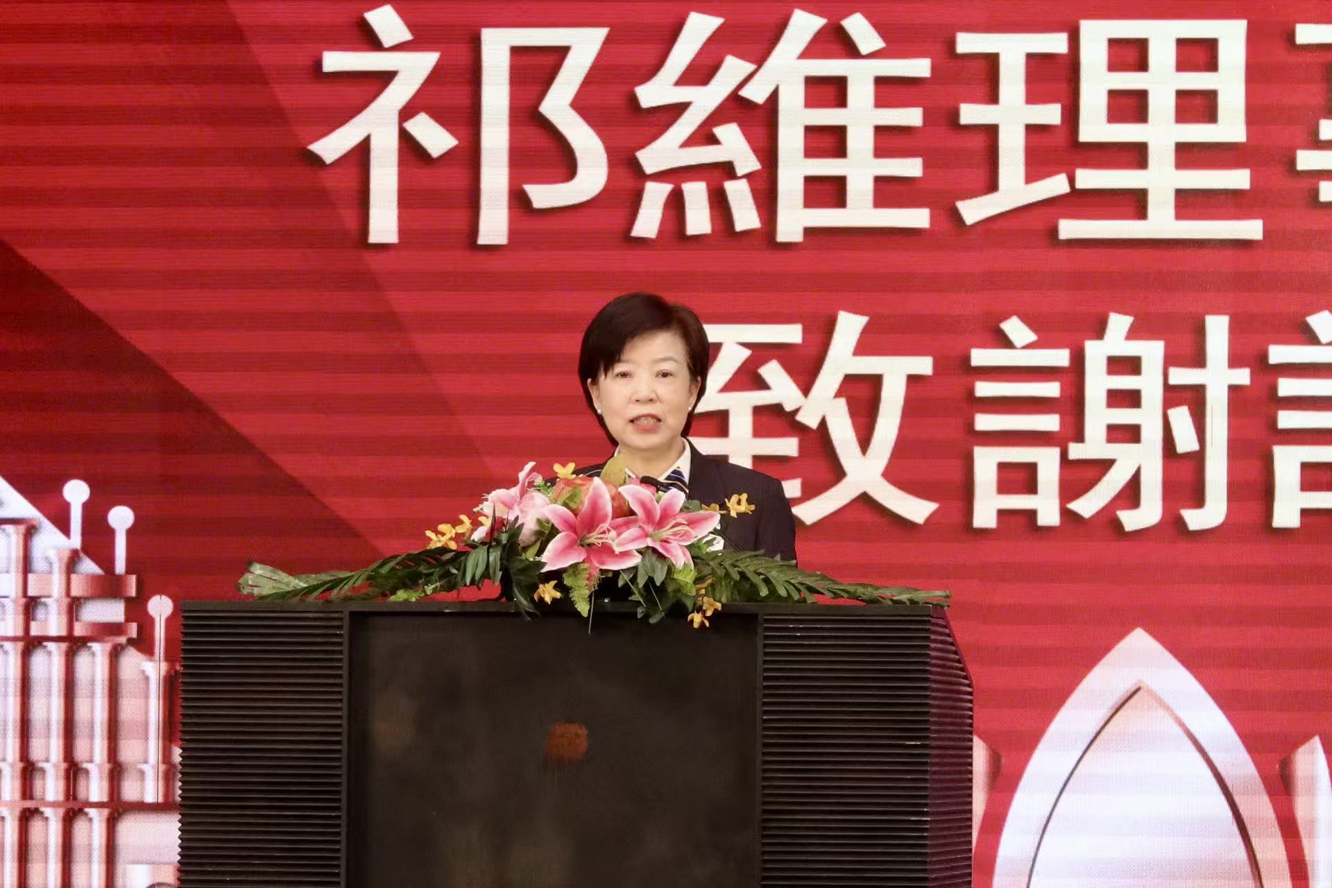 理事長祁維致謝詞,感謝母校、中聯辦、特區政府及社會各界的指導與支持,承諾新一屆理事會將緊扣宗旨,團結校友,以實際行動回饋社會、回報母校。