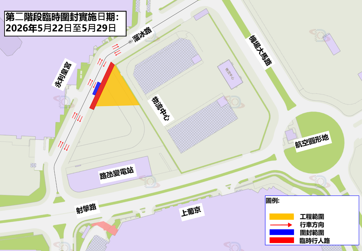 ·第二階段由2026年5月22日至5月29日,圍封溜冰路左側靠近物流中心一側一條行車道,全長約20米。