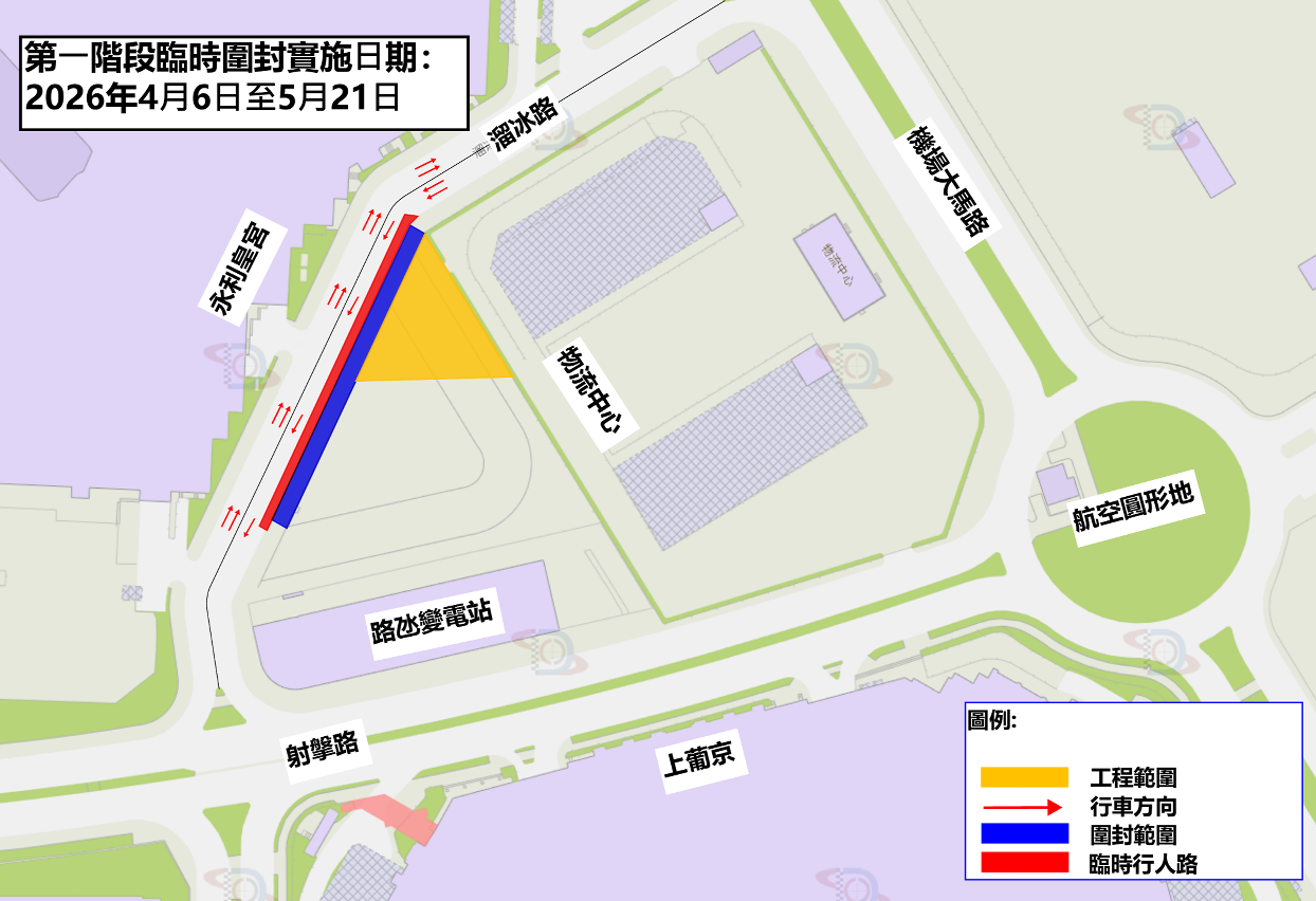·第一階段由2026年4月6日至5月21日,圍封溜冰路左側靠近物流中心一側行人道。佔用鄰近車道約1.5米闊範圍作臨時行人通道,全長約110米。