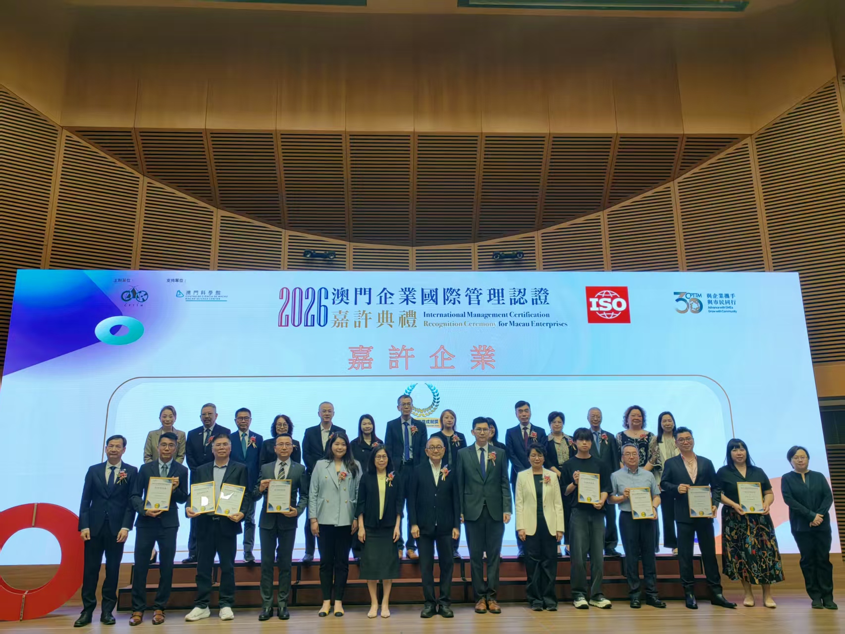 【即時新聞】生產力暨科技轉移中心下午舉辦2026企業國際管理認證嘉許典禮,向連續持有ISO認可超過6年、12年及20年的134間本澳企業頒獎。今年還特設「綜合管理成就獎」,共有8間企業獲嘉許。獲獎企業涵蓋運輸物流、環保技術、批發貿易、旅遊服務及物管等行業。