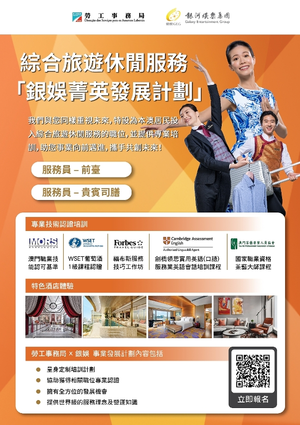 【即時新聞】勞工事務局(下稱“勞工局”)與銀河娛樂集團(下稱“銀娛”)合作推出“銀娛菁英發展計劃(酒店營運)”(下稱“計劃”),以“先入職、後培訓”方式,協助本澳居民提升專業技能與促進其職業生涯向上流動,該計劃由明(10)日起接受網上申請。