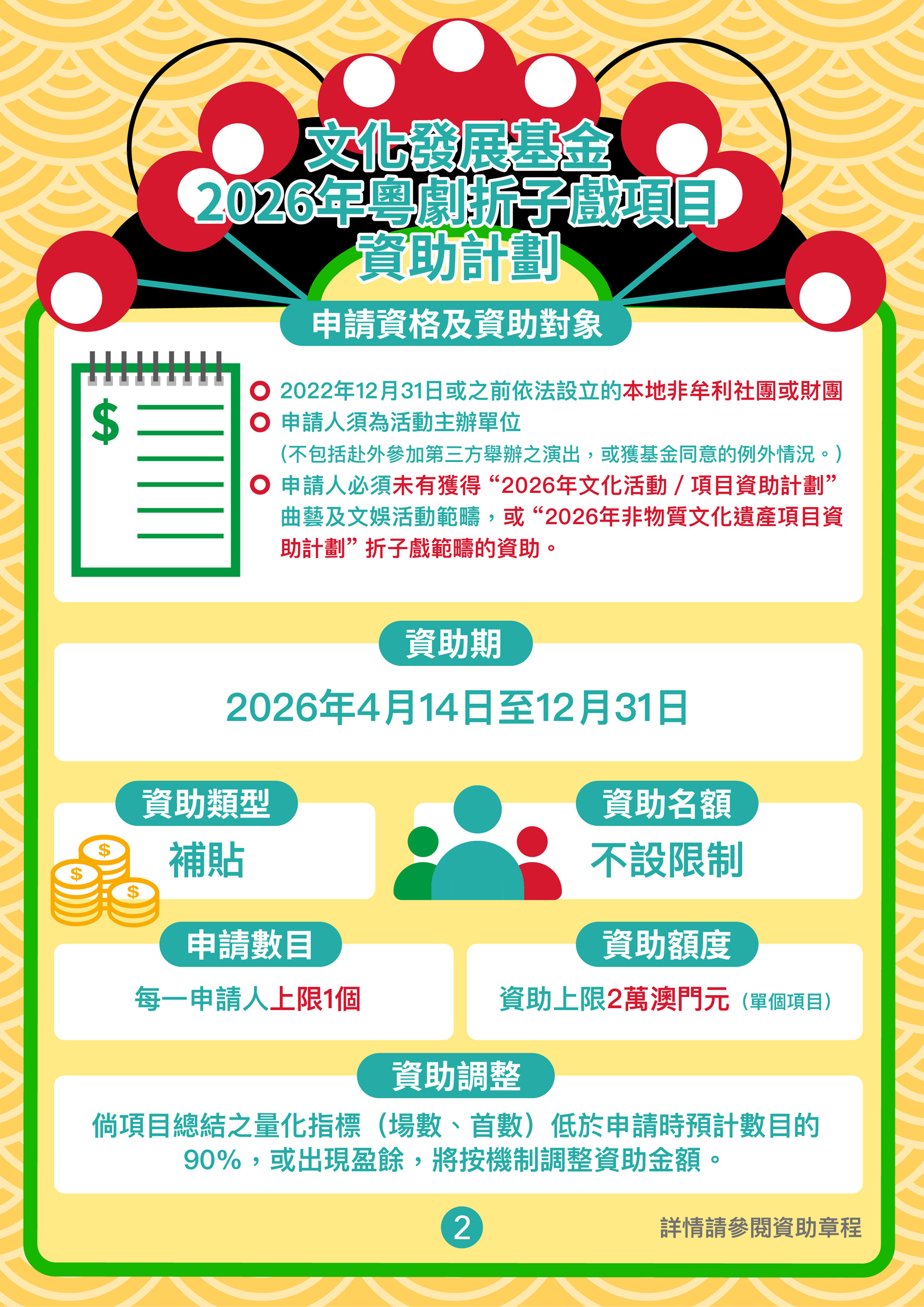 凡在本澳註冊的非牟利社團或財團均可提出申請,項目須為公開舉辦、供公眾參與,且整個演出內容均為粵劇折子戲。申請人須為活動主辦單位,並且未曾獲「2026年文化活動/項目資助計劃」曲藝及文娛活動範疇,或「2026年非物質文化遺產項目資助計劃」折子戲範疇的資助。