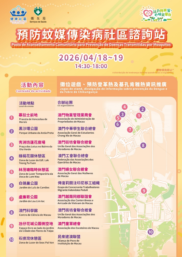當局將於周六日(18日及19日)在全澳設置十個“預防蚊媒傳染病社區諮詢站”,供居民了解正確防蚊知識與相關措施。地點包括慕拉士前地、黑沙環公園、青洲坊蓮花廣場、綠楊花園休憩區、林茂塘臨時休憩區、白鴿巢公園、盧廉若公園百步廊、澳門科學館、氹仔花城公園側之空地(近成都街)、石排灣休憩區(近樂群樓第四座)。活動涵蓋攤位遊戲和小禮品派發及孑孓(蚊幼蟲)及紗窗實物展示,透過互動讓居民了解白紋伊蚊習性及採取防蚊措施。