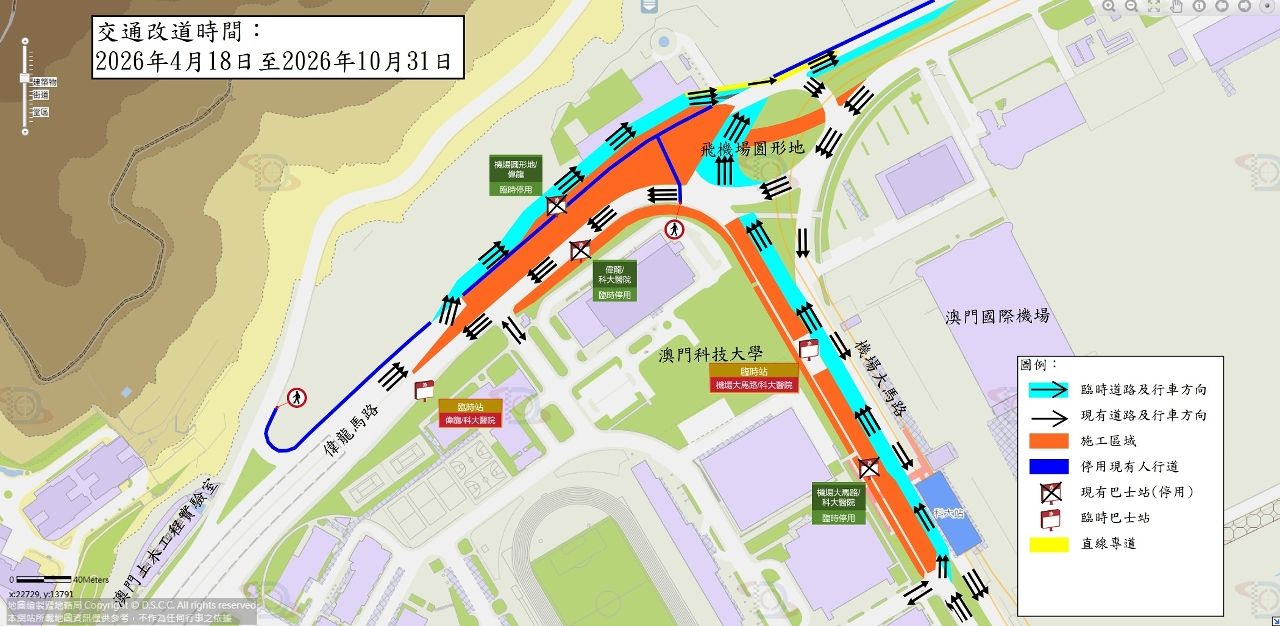為減低交通影響,經公共建設局與交通事務局協調,預計由2026年4月18日(周六)上午10時起,偉龍馬路、機場大馬路及飛機場圓形地將逐步實施交通改道,上述道路均維持與現時相同的三線行車,而偉龍馬路(往北安方向)將設置專用車道作疏導措施。請駕駛者留意現場指示及禮讓駕駛。