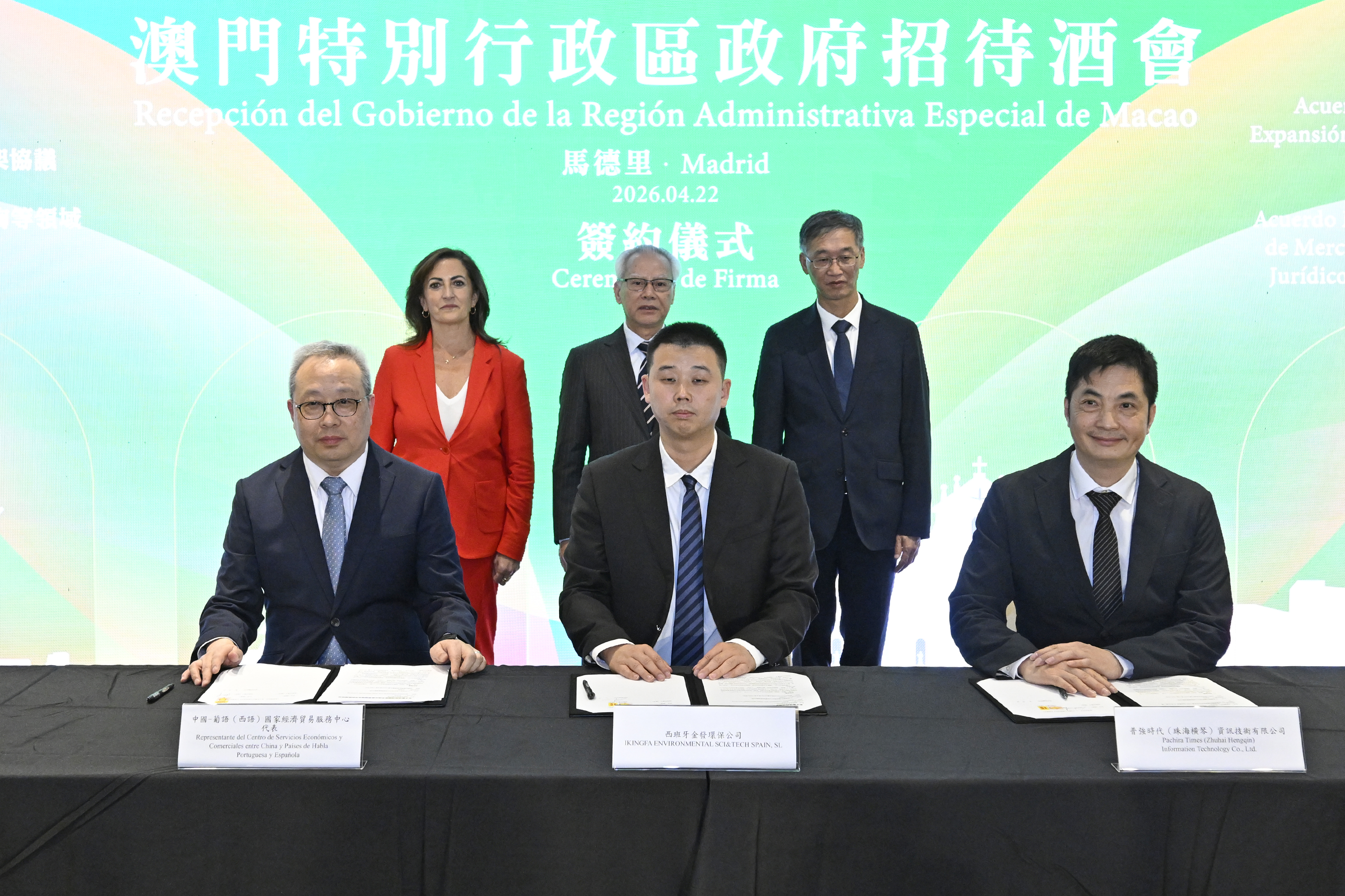 岑浩輝等主禮嘉賓在酒會上共同見證了5份合作協議的簽署,項目旨在促進特區政府相關部門與西班牙工商組織的友好往來和經濟交流,以及加強經貿合作服務。