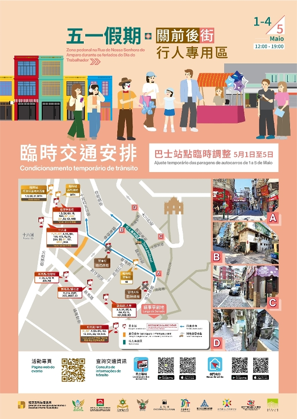 巴士服務方面,5月1日至4日每日早上11時至尾班車,氹仔舊城區四個巴士站將臨時停用,多條巴士路線需改道行駛,乘客可改用臨時站或周邊站點上落;另外,毗鄰關前後街區域的巴士路線則維持正常運作。因應節日期間新馬路的臨時巴士措施,5月1日至5日期間,途經草堆街的巴士路線全日實施臨時靠站安排。交通事務局已指示兩巴於客流高峰站點加強指示及增派人員協助分流乘客,並密切監測各站點候車情況,適時採取調度措施,確保公交交通有序運作。