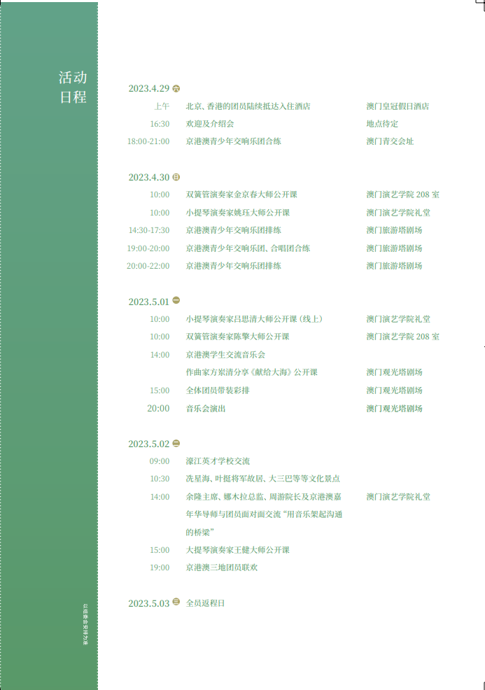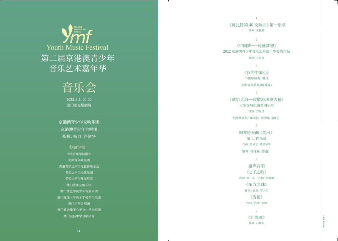 【即時新聞】第二屆京港澳青少年音樂藝術嘉年華將於2023年4月29日至5月3日在澳門舉辦,中央音樂學院附中校長娜木拉作為藝術總監,將帶領北京熱愛音樂的青少年,與來自香港演藝學院、亞洲青年弦樂團、香港希望之聲少兒慈善基金會希望之聲少兒弦樂團、少兒合唱團和澳門演藝學院、澳門青年交響樂團、澳門濠江英才學校、澳門嘉諾撒聖心英文中學、澳門浸信中學等學校、機構的愛樂青少年,齊聚澳門,組成京港澳青少年交響樂團和合唱團。