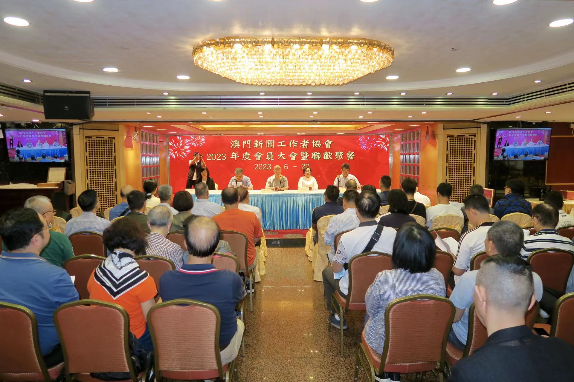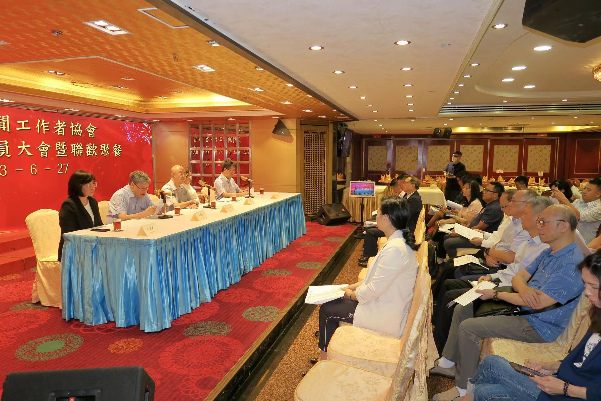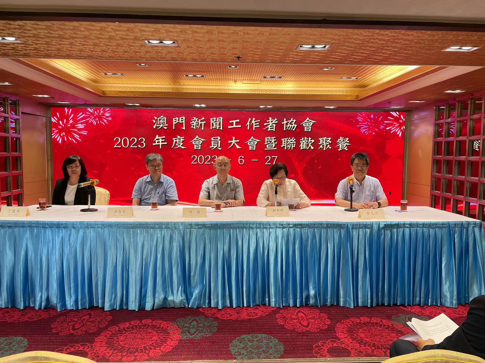 【即時新聞】澳門新聞工作者協會晚上舉行2023年度會員大會及會員聯歡聚餐。大會一致通過關於新屆第25屆領導機構任期的決議,通過第24屆理事會等多份工作報告。並選舉第25屆領導機構成員。陸波、鄭秀明分別連任會長、監事長,胡根當選新任理事長。