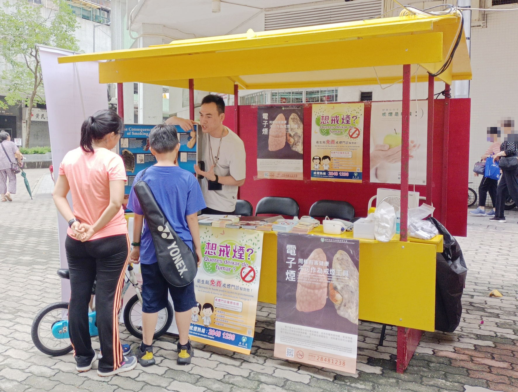此外,為響應「世界無煙日」,衛生局舉辦「煙害諮詢站」活動,於5月的每個週六下午輪流於本澳多個地方設置站點,向居民解答有關煙害的查詢、為有興趣戒煙人士提供一氧化碳含量、尼古丁依賴程度的測試及血壓測量服務,並宣傳衛生局的戒煙門診服務;現場亦擺放煙害展板及模型教具及提供「下一代 無煙害」為主題的拍照相框道具供居民拍照留念。是次的「煙害諮詢站」活動獲得巿政署協助借出包括白鴿巢公園、仔花城公園側、黑沙環公園和綠楊花園休憩區等場地。