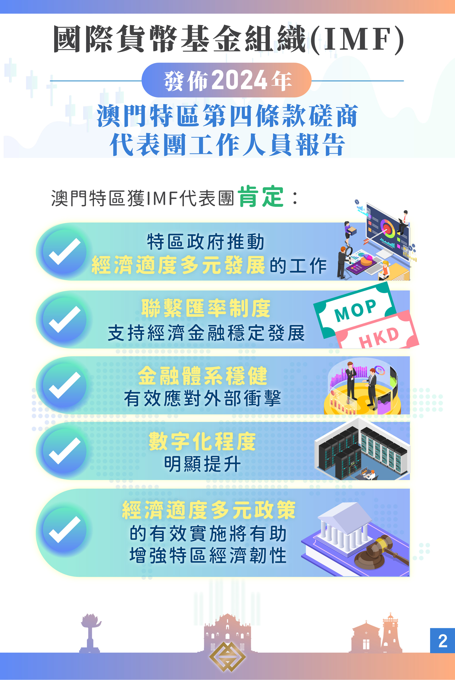 IMF再次肯定澳門元與港元的聯繫匯率制度,為澳門特區的經濟金融穩定提供可靠的支撐。同時,嚴格的財政紀律、穩健的銀行體系、充足的外匯儲備,以及靈活的勞動力市場等關鍵因素,將確保聯繫匯率制度的有效運行。