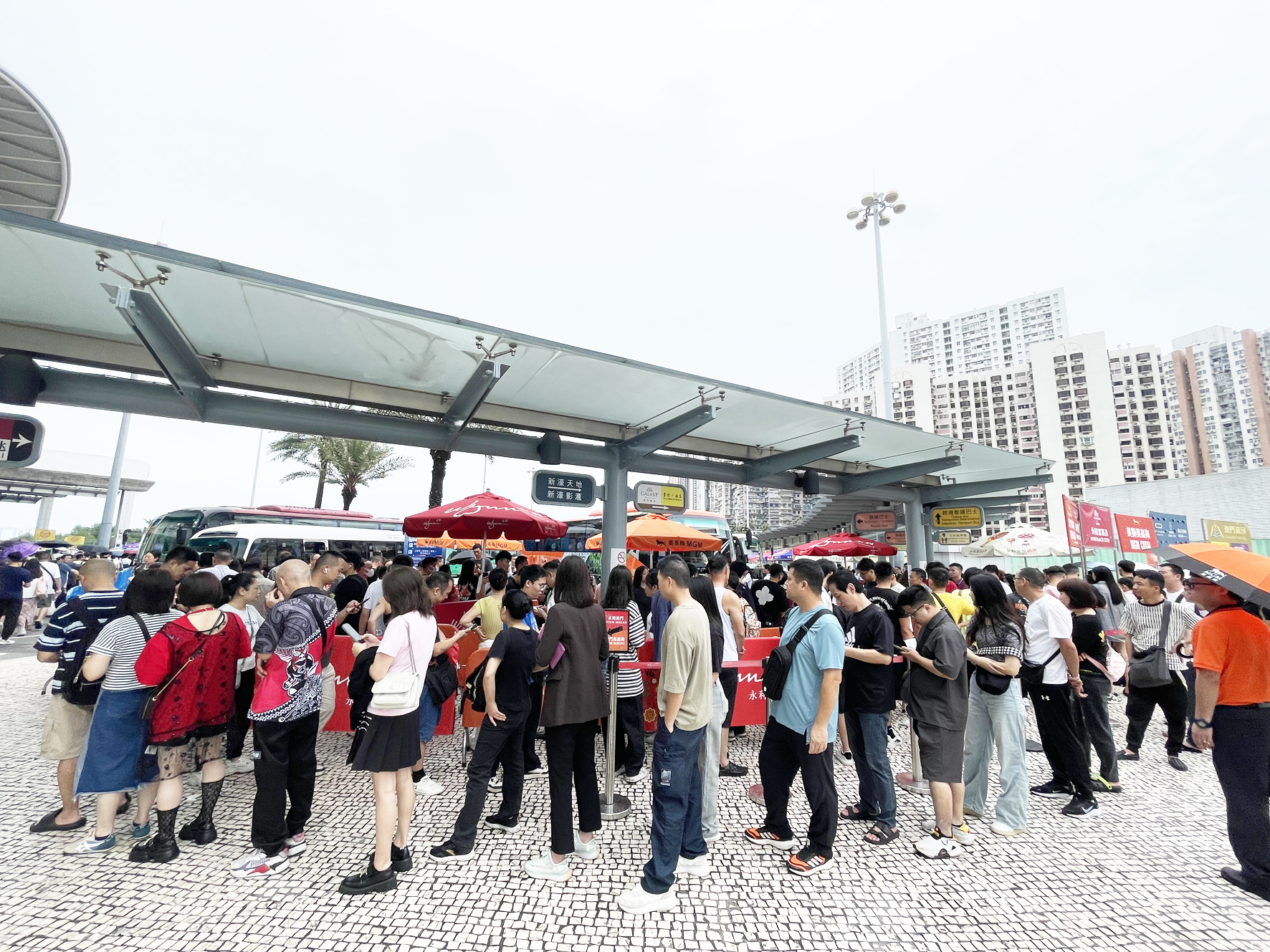 昨日下午二時關閘口岸一帶人流暢旺,酒店發財巴大排長龍並加設鐵欄疏導乘客,現場有警員維持秩序,疏導人流。為應對節假日關閘口岸乘客需要,節日期間兩家巴士公司在口岸設置諮詢站,並增設時節巴士路線,疏導乘客。