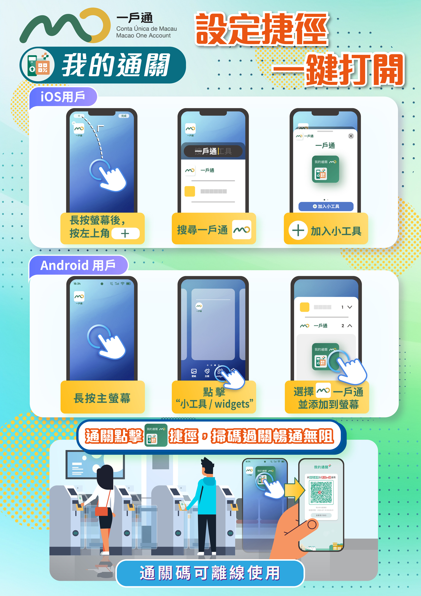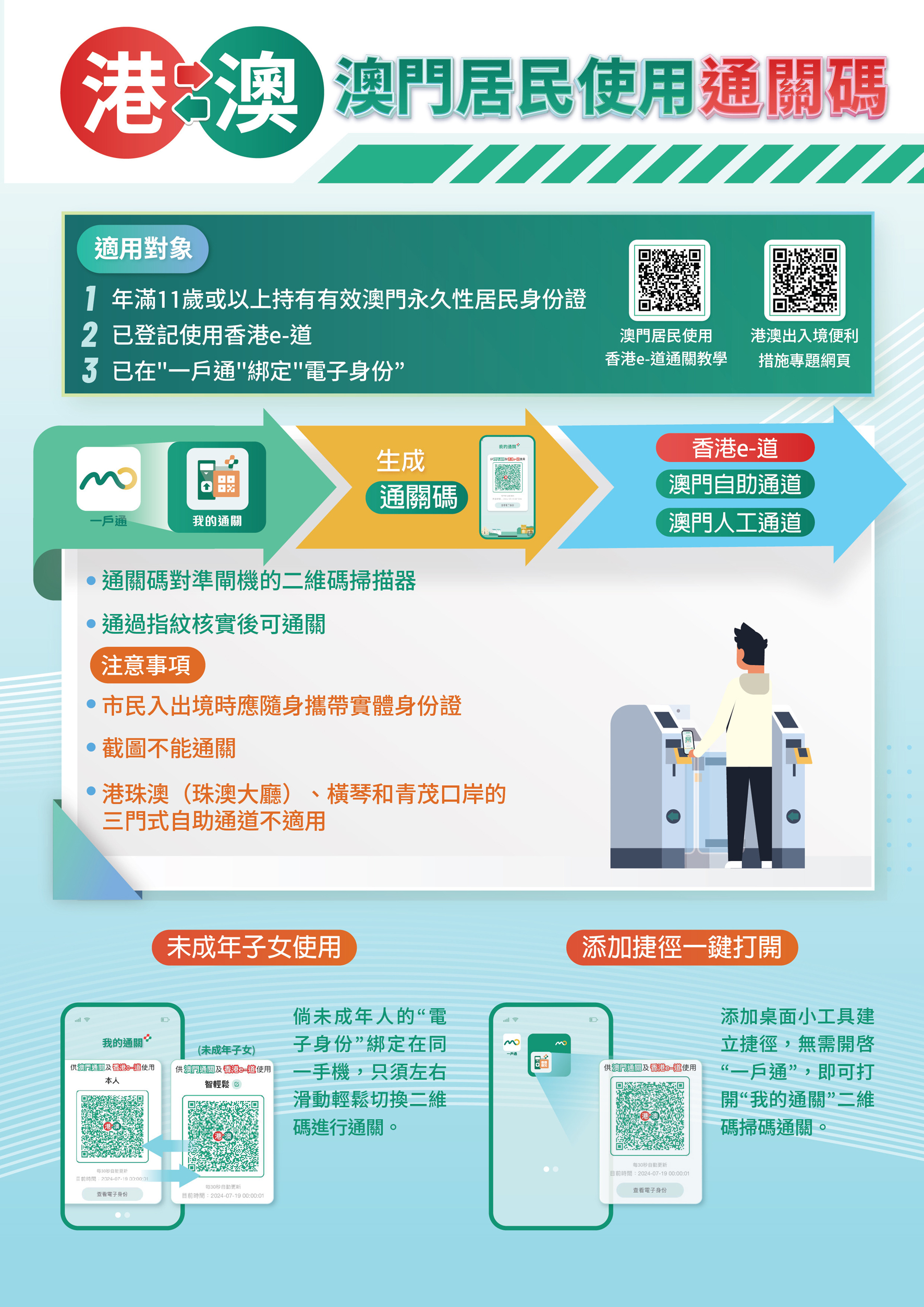 凡年滿11歲的澳門永久性居民身份證持有人,成功登記使用香港e-道服務及在「一戶通」綁定電子身份後,便可於通關時打開一戶通「我的通關」生成「港澳通關二維碼」,使用香港e-道服務入出境香港。如未成年人的「電子身份」綁定在父/母或監護人的手機上,隨行過關時,父母或監護人只須在「我的通關」二維碼介面左右滑動,便可輕鬆切換為對應人士的二維碼。另外,在更新「一戶通」後,可透過添加桌面小工具建立捷徑,離線亦可使用。