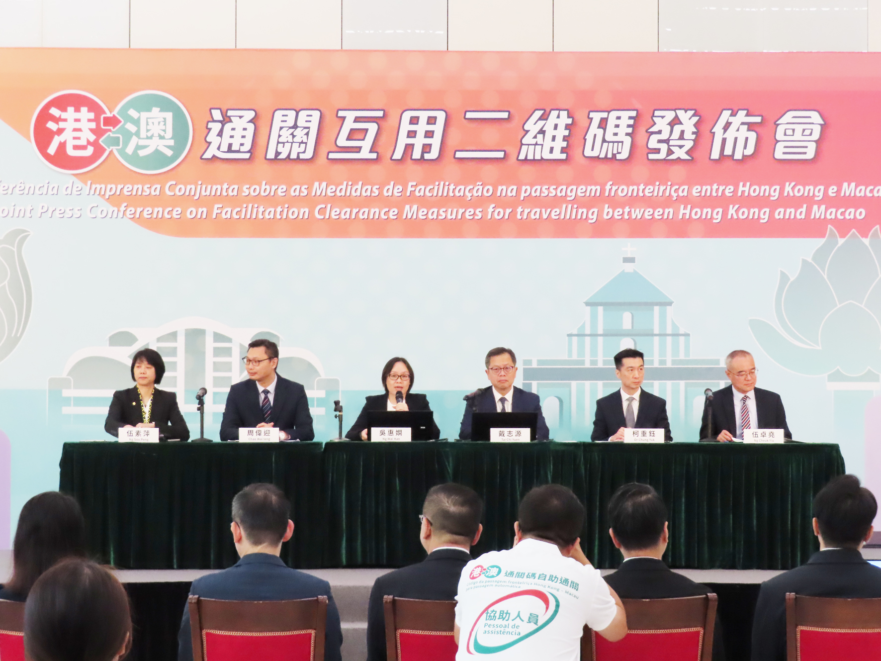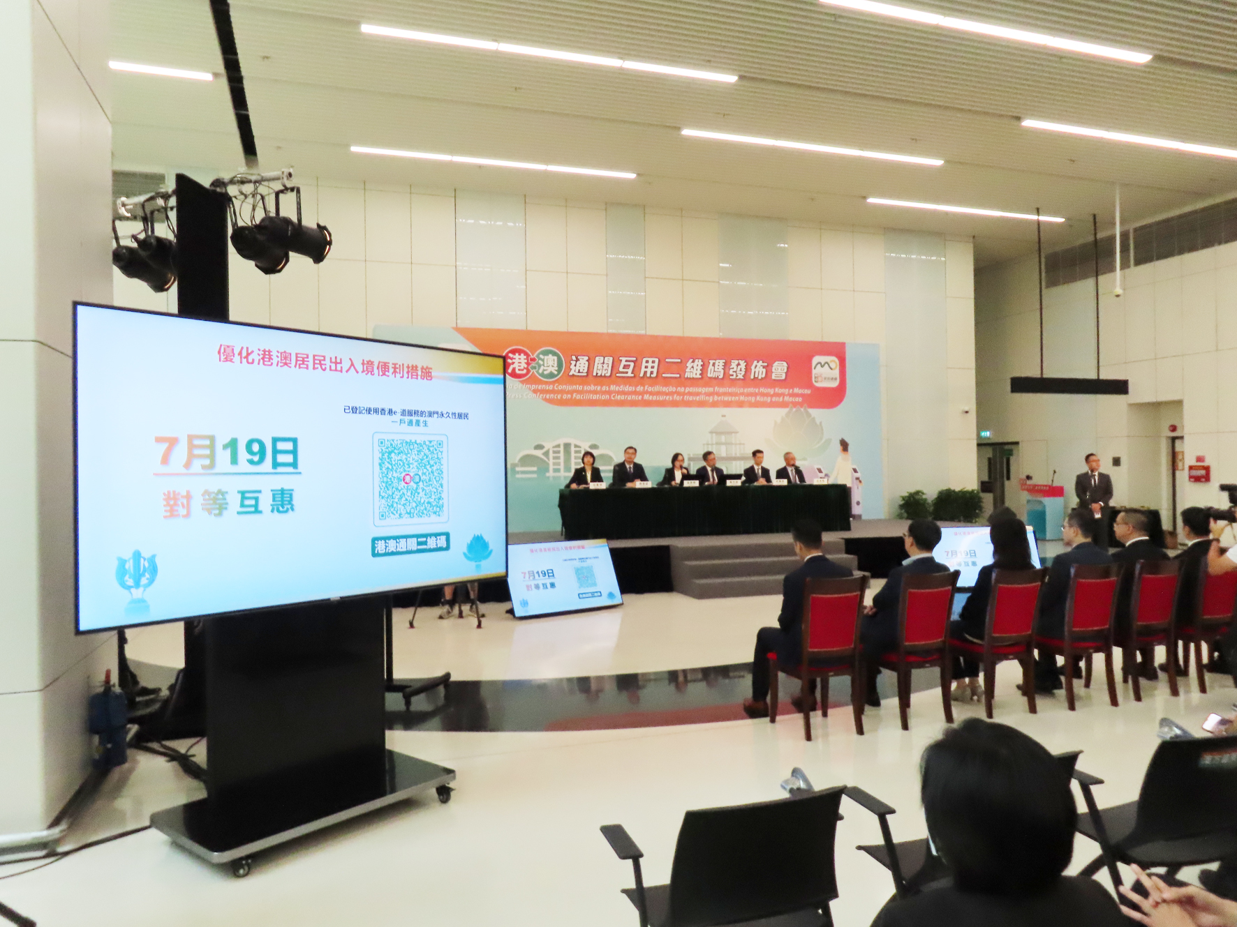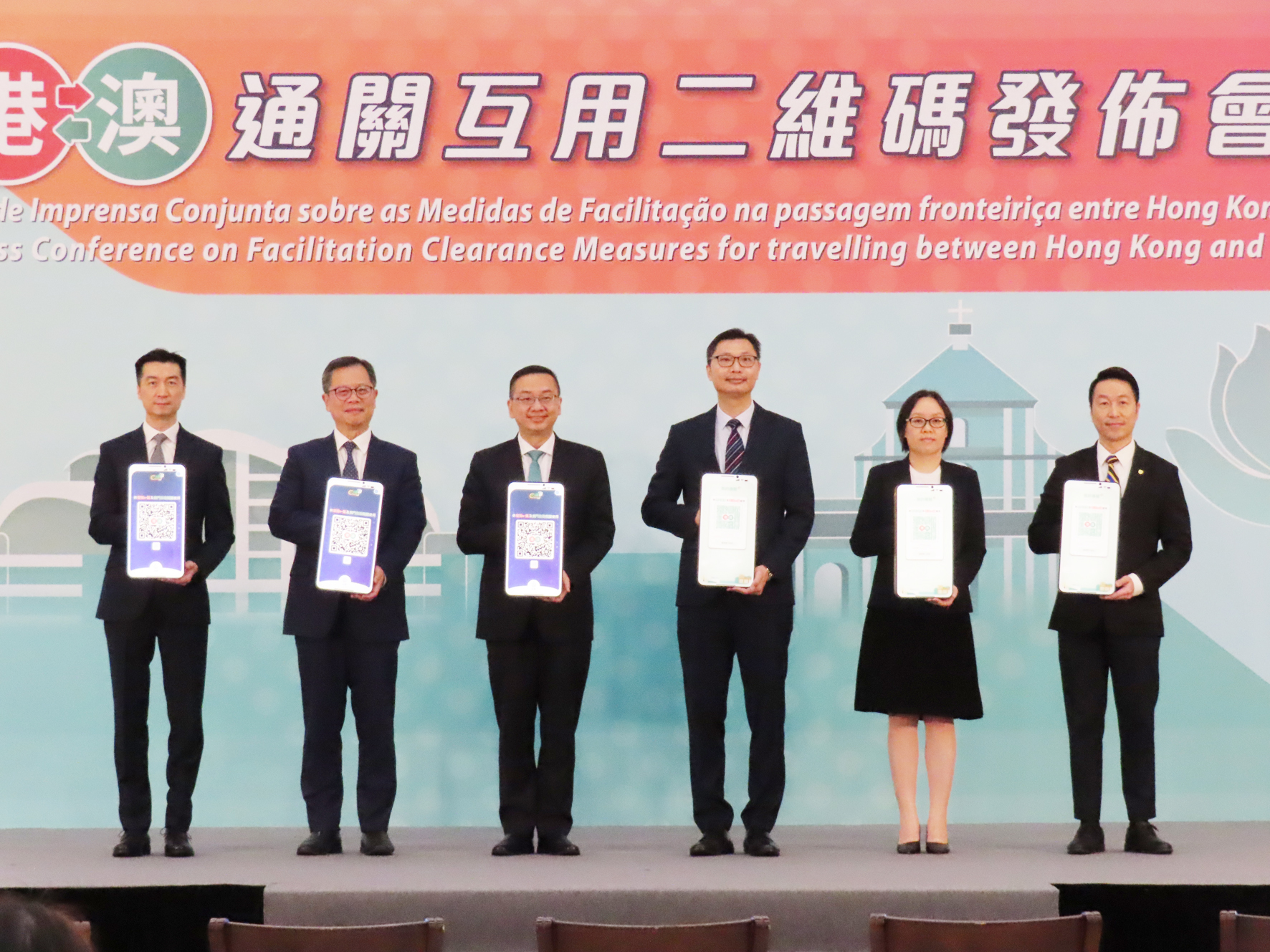 兩地政府昨日上午十時半假港珠澳大橋澳門邊檢大樓舉行「港澳通關互用二維碼」發佈會,啟動儀式由香港入境事務處處長郭俊峰、澳門身份證明局局長周偉迎、澳門行政公職局局長吳惠嫻、澳門治安警察局代局長黃偉鴻、香港入境事務處副處長戴志源及香港入境事務處助理處長柯重鈺主禮。