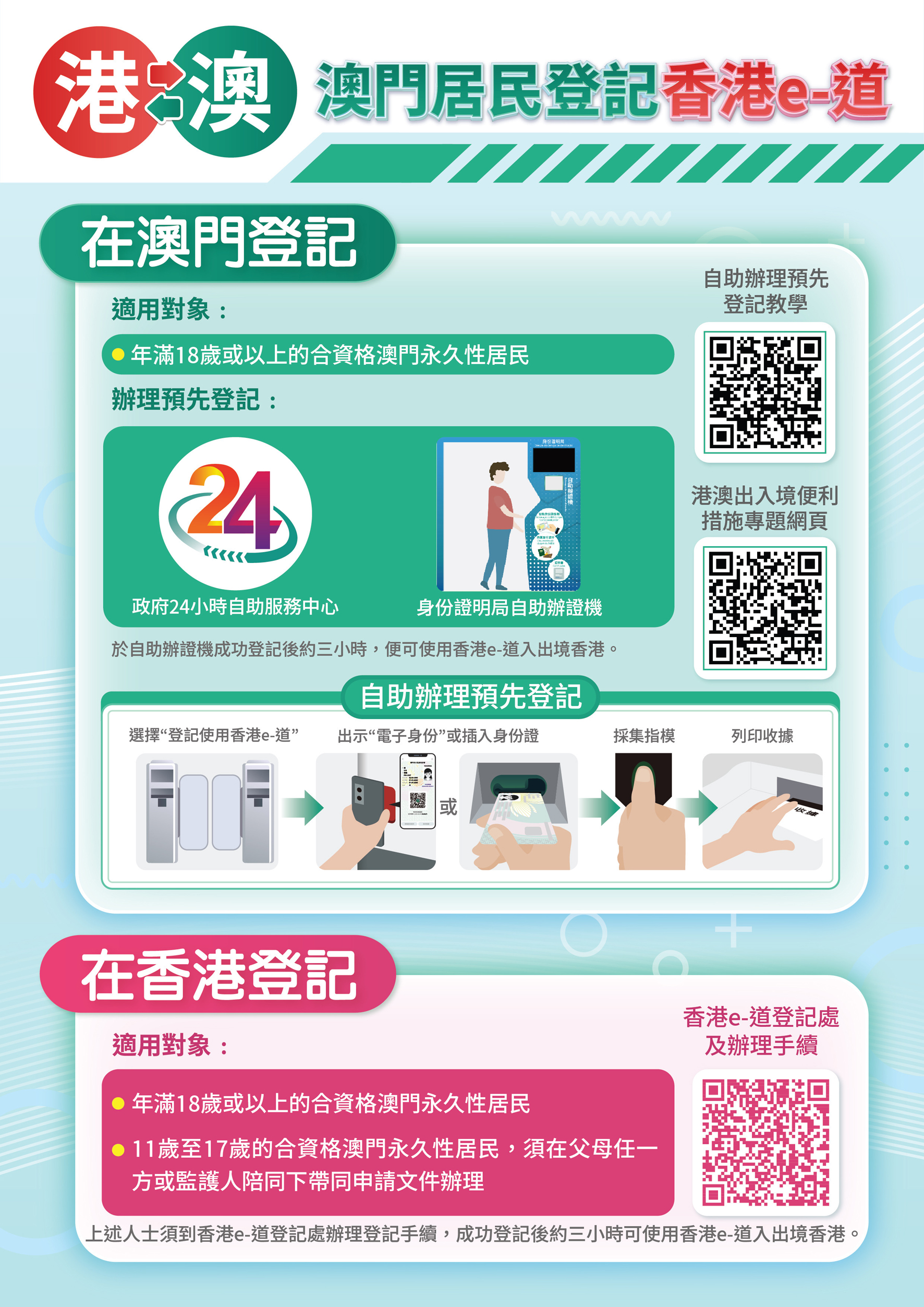 年滿11歲的合資格澳門永久性居民可在預先登記後使用香港e-道入出境香港,登記程序可於香港、澳門或橫琴進行。年滿18歲的澳門永久性居民可於澳門7個政府24小時自助服務中心的自助辦證機,以及橫琴粵澳深度合作區政務服務中心24小時自助服務區的「澳證易」自助辦證機進行登記。而年滿11歲至17歲的澳門永久性居民必須在父/母或監護人陪同下,帶同申請文件親臨香港e-道登記處辦理,地點包括香港入境事務處總部、尖沙咀中國客運碼頭入境大堂、上環港澳客輪碼頭入境大堂、啟德郵輪碼頭入境大堂、港珠澳大橋香港口岸入境大堂。成功登記後約3小時,便可在香港e-道使用澳門永久性居民身份證或打開一戶通「我的通關」生成「港澳通關二維碼」通關。