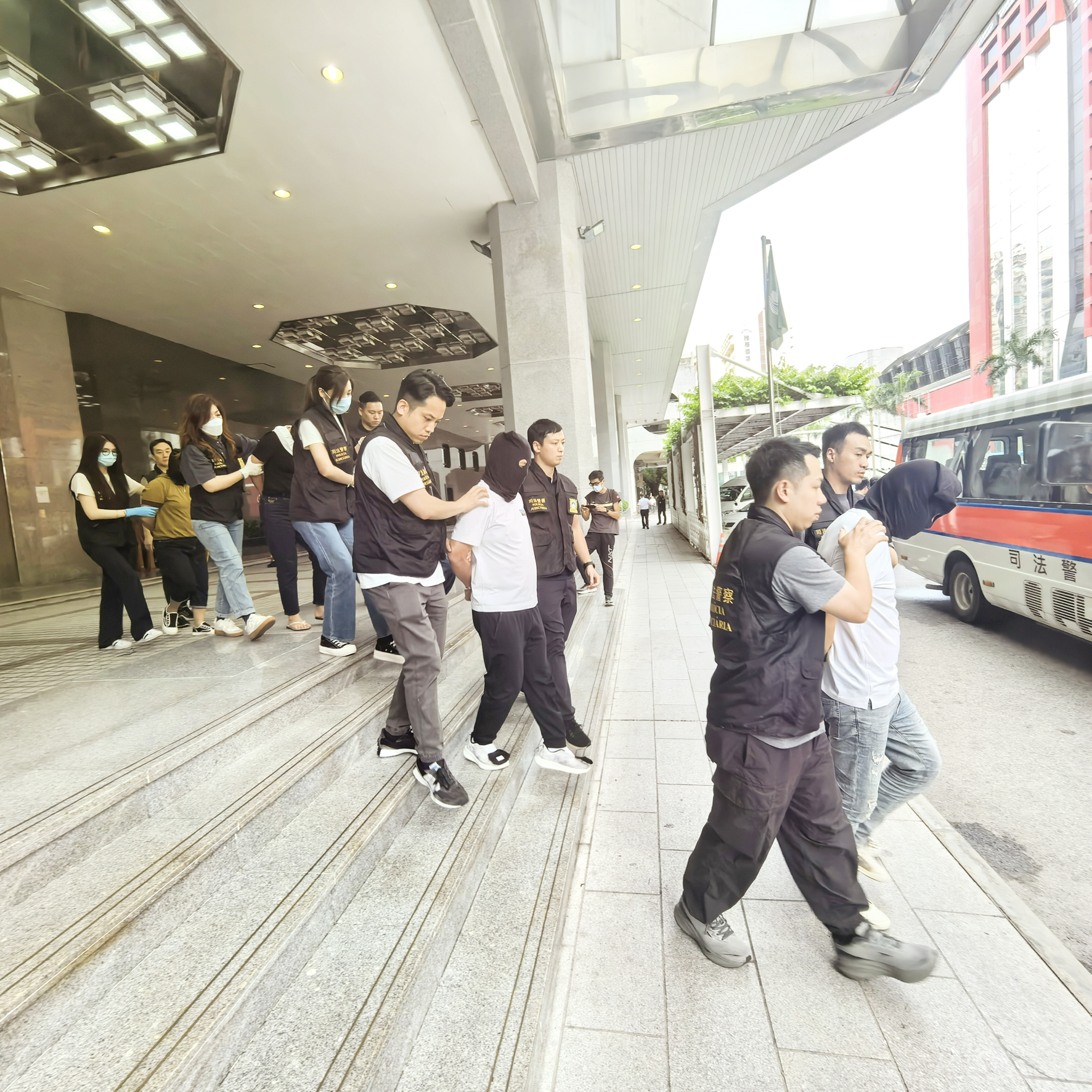司警局接報後立即展開調查,迅速鎖定涉案的四人及在外圍把風的李某。案發當日下午5時,警方在新口岸某酒店將五人拘捕,並成功起回全數騙款及贓物。