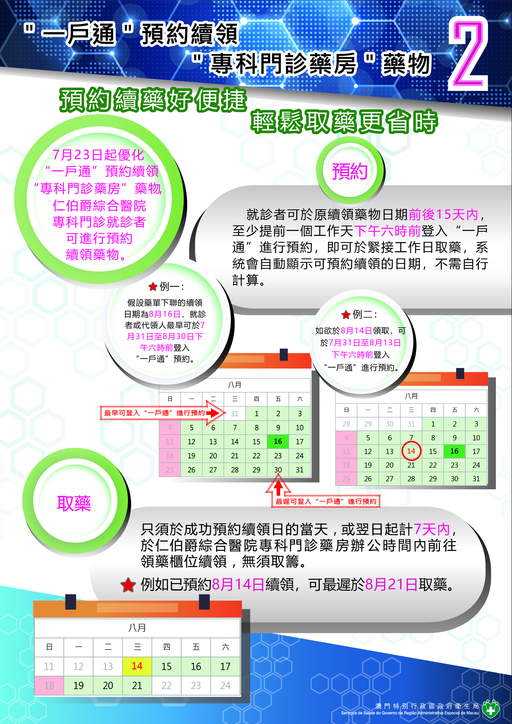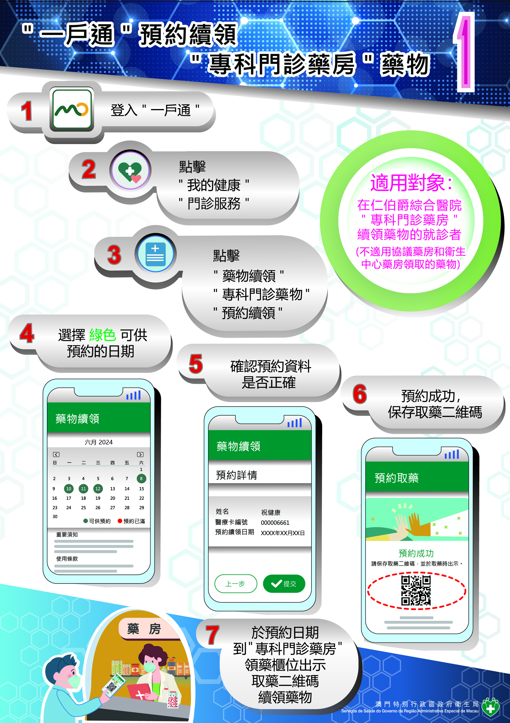 【特訊】為配合特區政府電子政務發展,推動智慧醫療,進一步便利就診者或代領人領取仁伯爵綜合醫院專科門診藥物和縮短輪候領藥時間,衛生局於即日起優化「一戶通」預約續領「專科門診藥房」藥物服務,包括延長可續領藥物的日期及預約時間,具體如下: