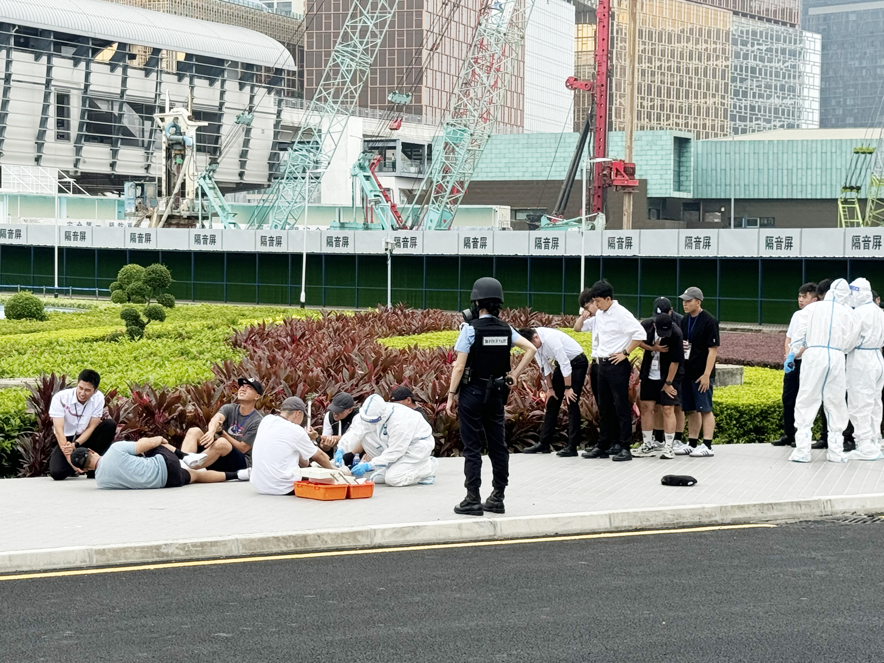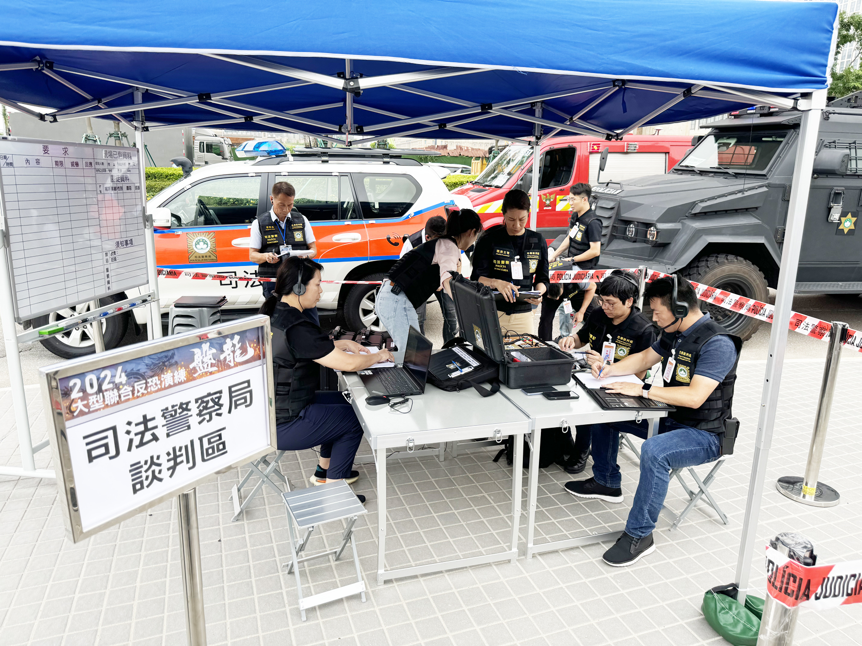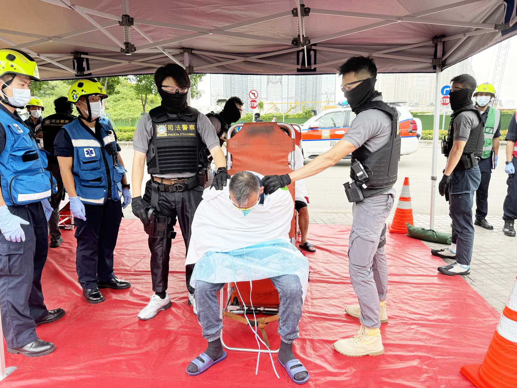 【特訊】警察總局聯同中國人民解放軍駐澳部隊,並協調澳門海關、治安警察局、司法警察局、消防局、衛生局、新聞局及體育局等多個部門及機構,昨日下午在東亞運動會體育館,進行了代號「盤龍」的大型聯合反恐演練,以完善本澳的保安指揮體系,增強跨部門間的快速協作機制。演練共派出1,038人參與,過程順利,達到預期效果。