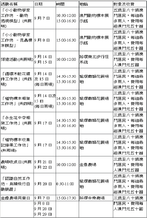 【特訊】為提升市民的生態保育意識及動植物種科普知識,並有更多機會接觸大自然及享用綠化休閒設施,市政署將於九月舉辦多場大自然活動、自然教育工作坊及金像農場同樂日活動,適合一家大小參與,歡迎市民報名參加。