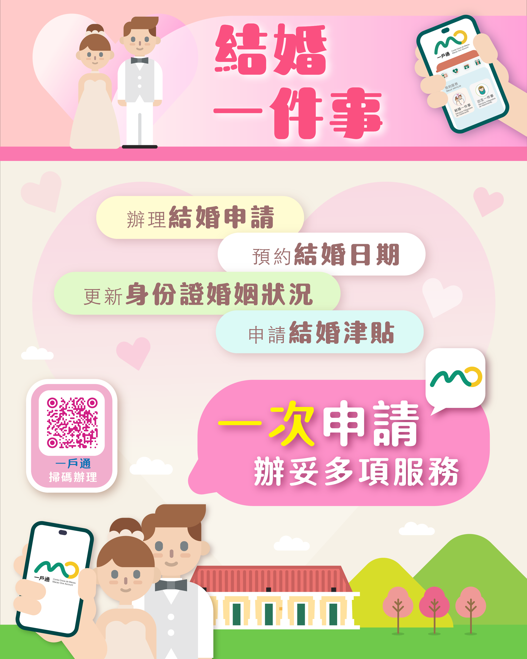 「結婚一件事」服務讓合資格的結婚人一次過辦理結婚申請、預約結婚日期、更新身份證婚姻狀況以及申請結婚津貼的服務。倘由登記官主持結婚,更可於登記後即時更新澳門居民身份證的婚姻狀況及領取結婚證明。