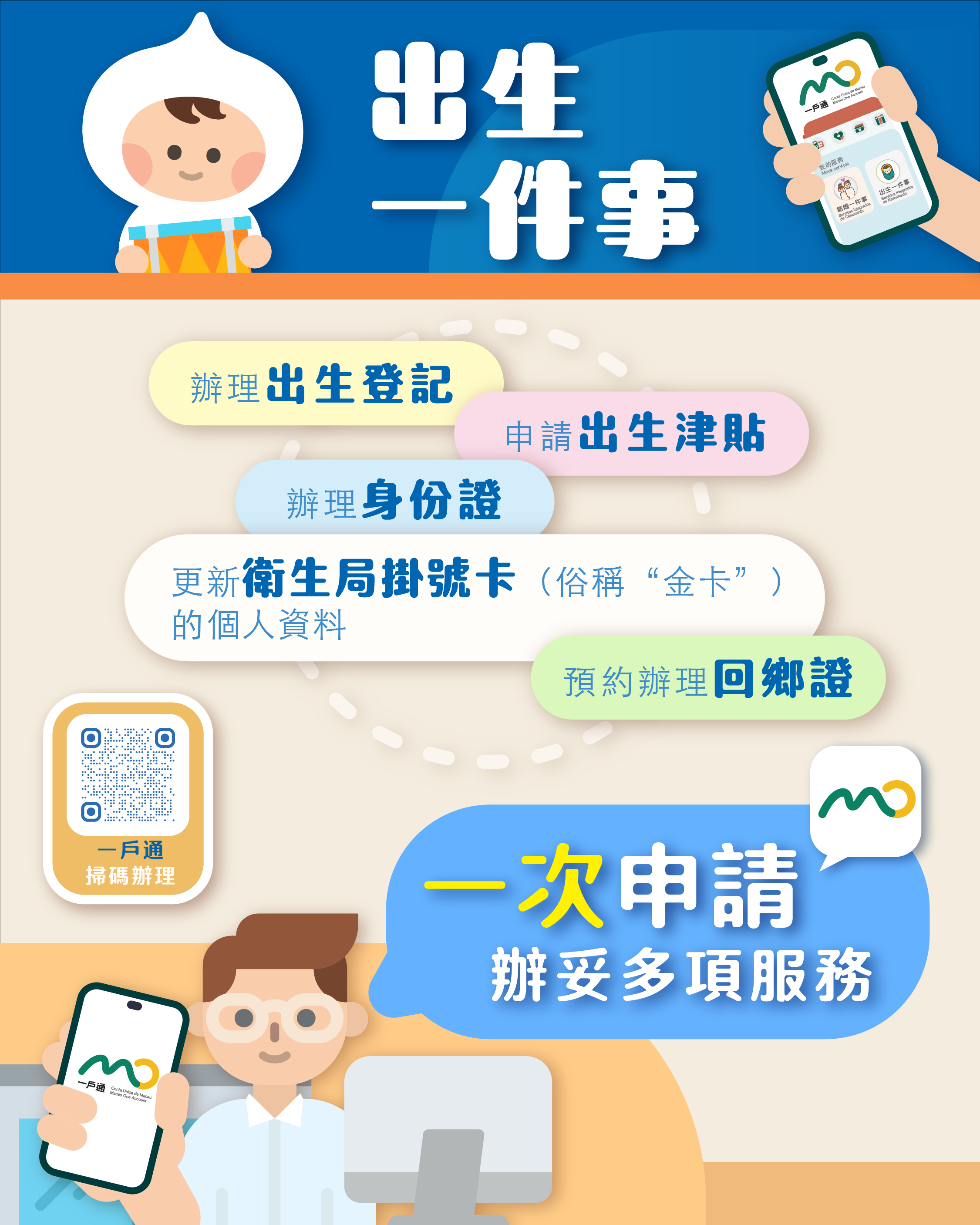 「出生一件事」則提供出生登記、辦理新生兒身份證、更新衛生局掛號卡個人資料、申請出生津貼以及預約辦理回鄉證的集成服務,讓合資格的新生兒父母一次辦妥與新生兒出生相關的多項服務,安心照顧新生兒,毋須再為辦理有關手續而奔波。