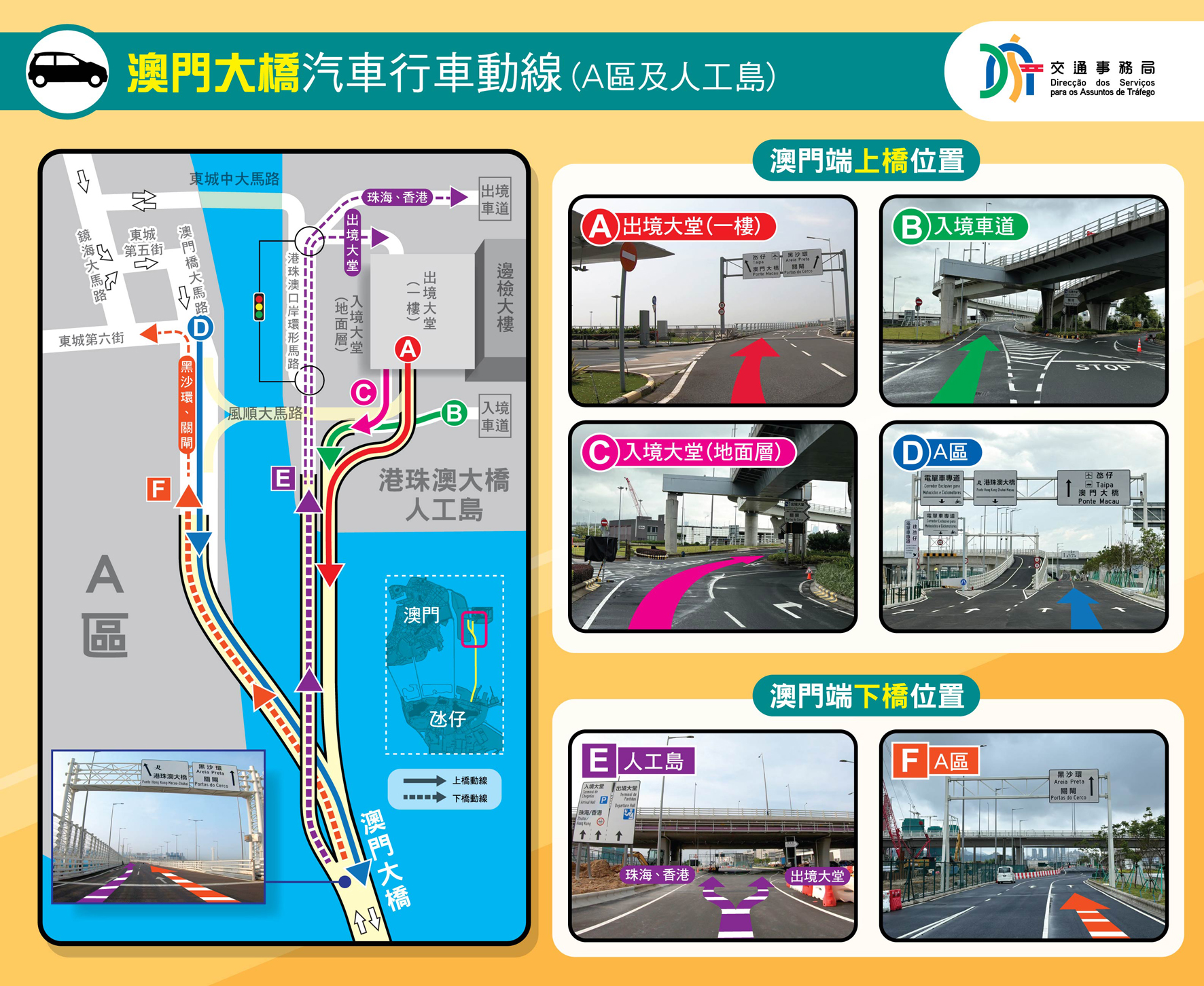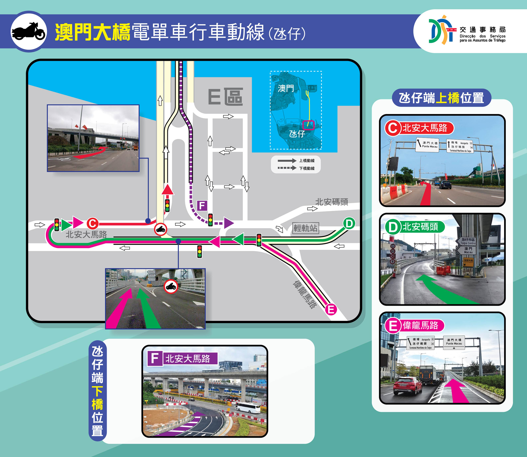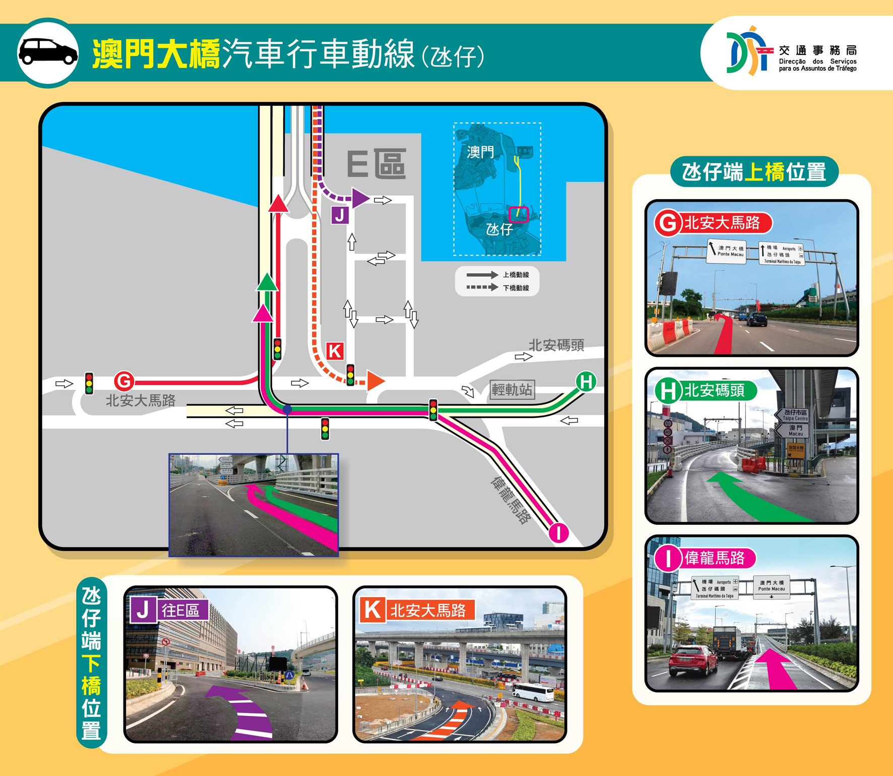 公建局及交通局於昨日下午四時舉行新聞發佈會介紹澳門大橋開通初期交通安排。交通事務局交通規劃處處長源秋華表示,為理順澳門大橋開通後的車流交織情況、分流前往不同目的地之車輛,以及保障交通安全,E區內部份道路早前亦已調整行車安排;偉龍馬路行車天橋和北安大馬路新增的5組交通訊號燈亦會配合澳門大橋開通投入運作。另外,設於北安大馬路上的兩個調頭處行車安排亦會有所調整,其中,近友誼大橋一側的調頭處僅供來自偉龍馬路行車天橋的車輛使用,以前往澳門大橋電單車專道或新城E區,同時,為理順行車秩序,該調頭處禁止來自北安圓形地方向的車輛使用,相關車輛可取道早前於偉龍馬路行車天橋下方新增的調頭處。
