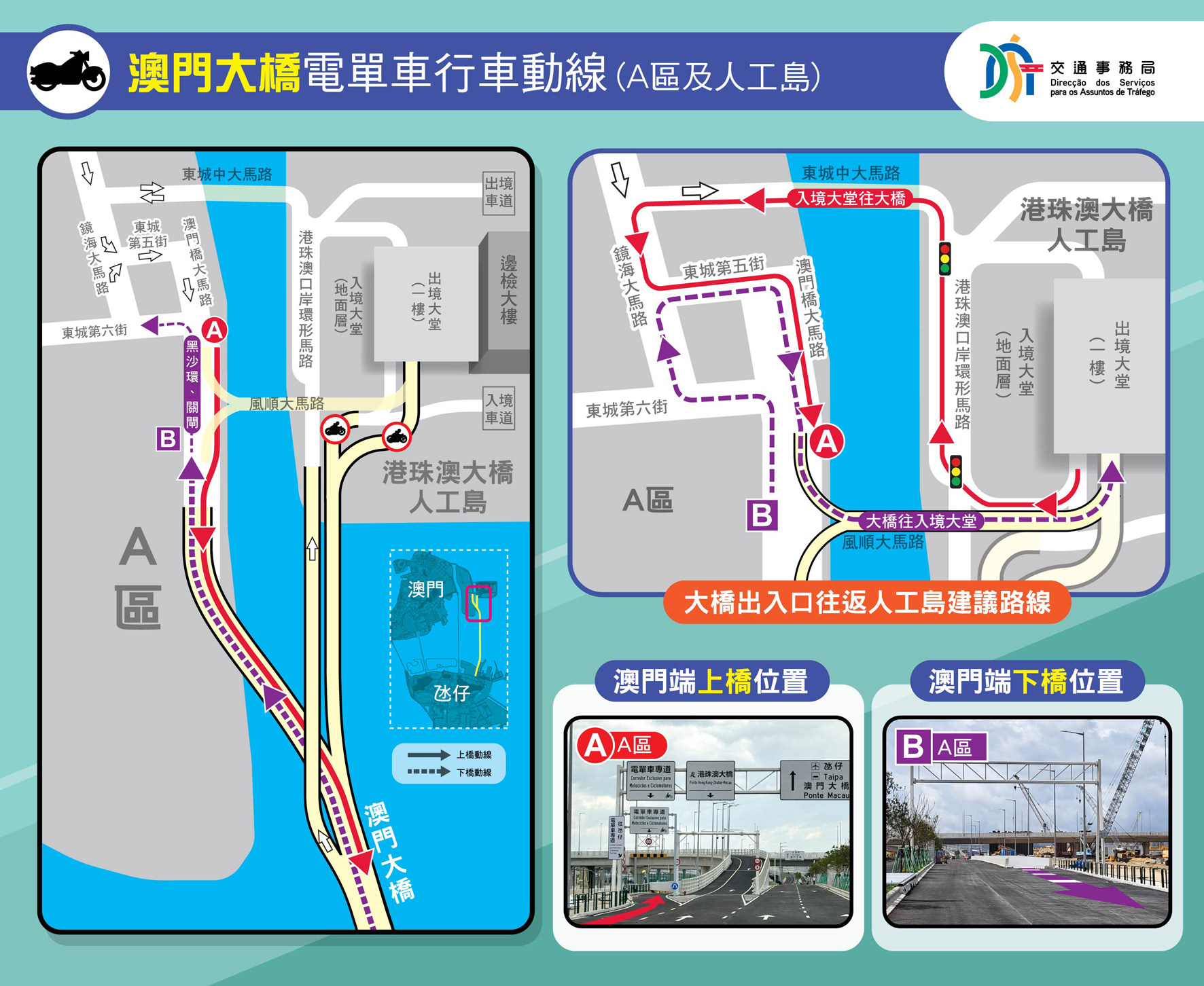 治安警察局交通廳警司何嘉傑表示,澳門大橋的電單車專道設有獨立的出入口,呼籲駕駛者提前瞭解行車路線,留意路面情況及現場指示牌,及早選定行車方向及路線。