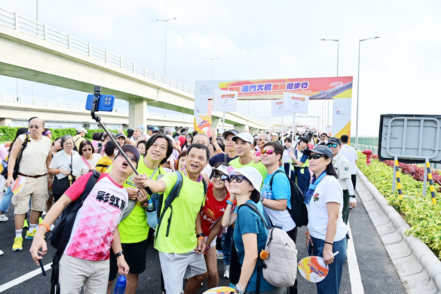 健步行活動分團體和個人參加者,共吸引2.1萬人參與,其中團體早上8時起步,約有150個團體參加,當中包括兒童及長者,亦有8個殘疾人士團體及康復組織合共約80人參與健步行;而個人則分別為上午9時及10時起步。參與者由澳門大橋連接氹仔北安引橋處出發,步行至澳門大橋接近A區引橋的位置再折返至氹仔北安起點,全程約6公里,全程約需1.5小時,中途不設離場通道;不少人沿途拍照打卡,欣賞新大橋風景,氣氛熱鬧。