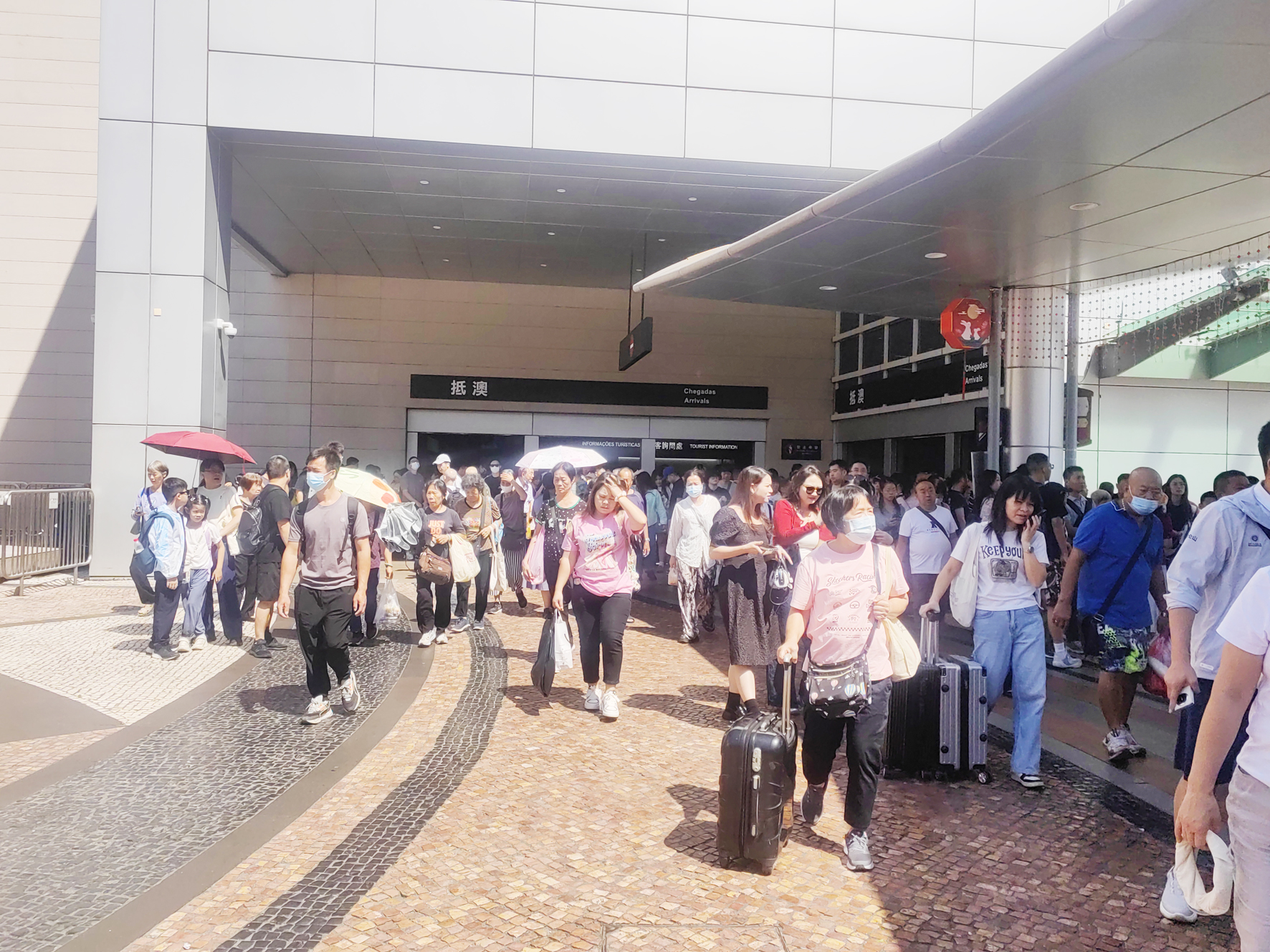 記者在關閘口岸所見,訪澳旅客人流如鯽,不少旅客拖著旅行箱來澳,隨即在關閘廣場口岸旁排隊等候乘搭免費穿梭巴士到離島或中區遊玩,巴士公司在關閘廣場設諮詢處以指導乘車,口岸的士站現候車人龍,多名警員維持秩序。