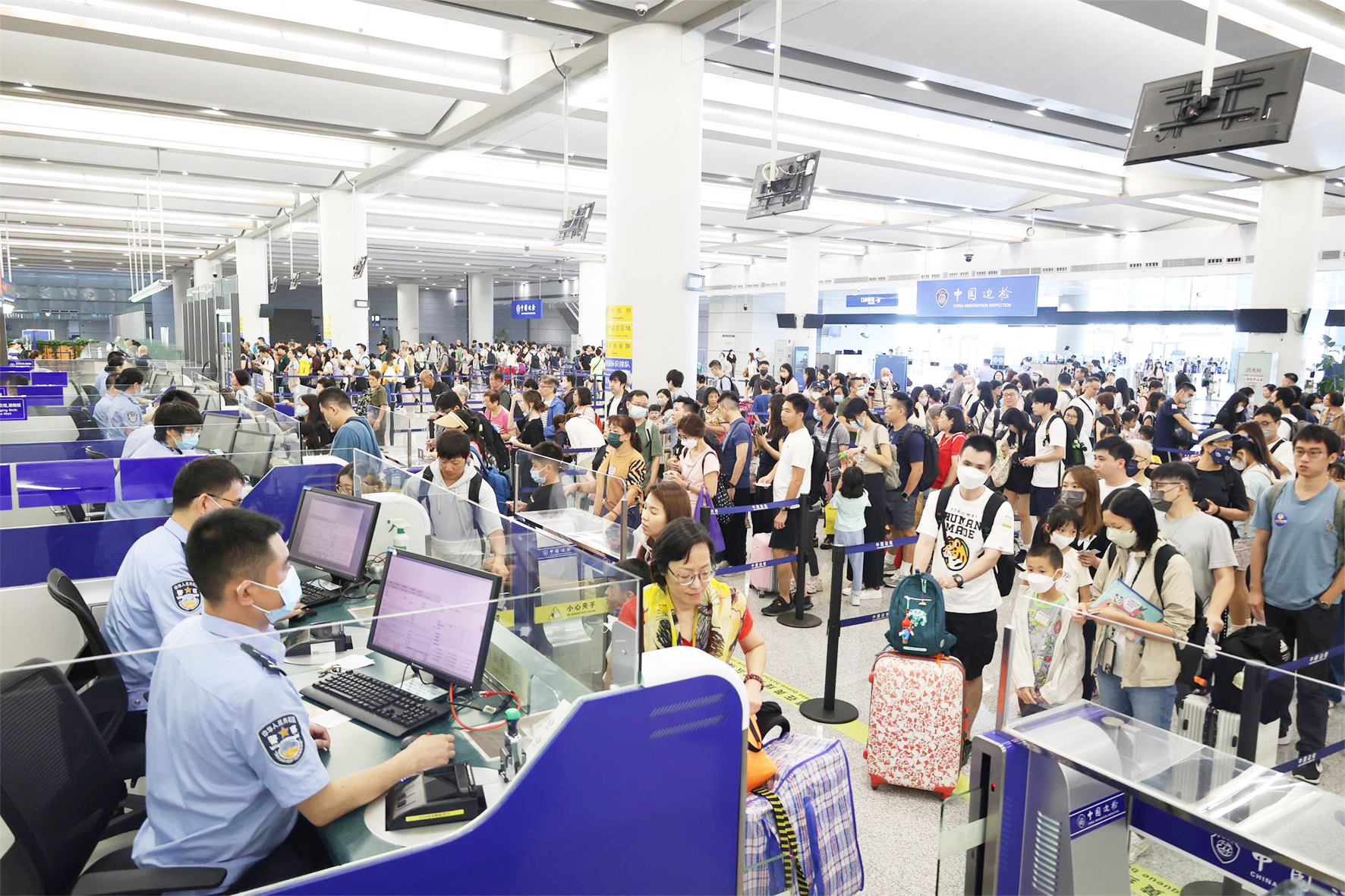 為保證出入境人員車輛安全暢順,港珠澳大橋邊檢站持續優化通行環境,通過升級改造「一站式」系統,推進「貨兼客」通道建設,提高通關效率;積極落實為民服務舉措,增派一線執勤、應急、備勤警力,引入專業志願者服務團隊,不斷提高人員車輛通關體驗感;持續深化三地口岸執法聯絡協調機制,強化與港澳方的資訊共用和勤務協作,實現節假日客流車流提前預警、有效疏導。