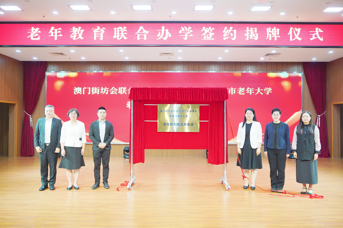 儀式上,珠海市老年大學、街總廣東辦事處、珠海市香洲區境海坊眾教育培訓有限責任公司簽訂老年教育聯合辦學合作協議,主禮嘉賓共同為「澳門街坊會聯合總會廣東辦事處 珠海市老年大學老年教育聯合辦學點」揭牌。