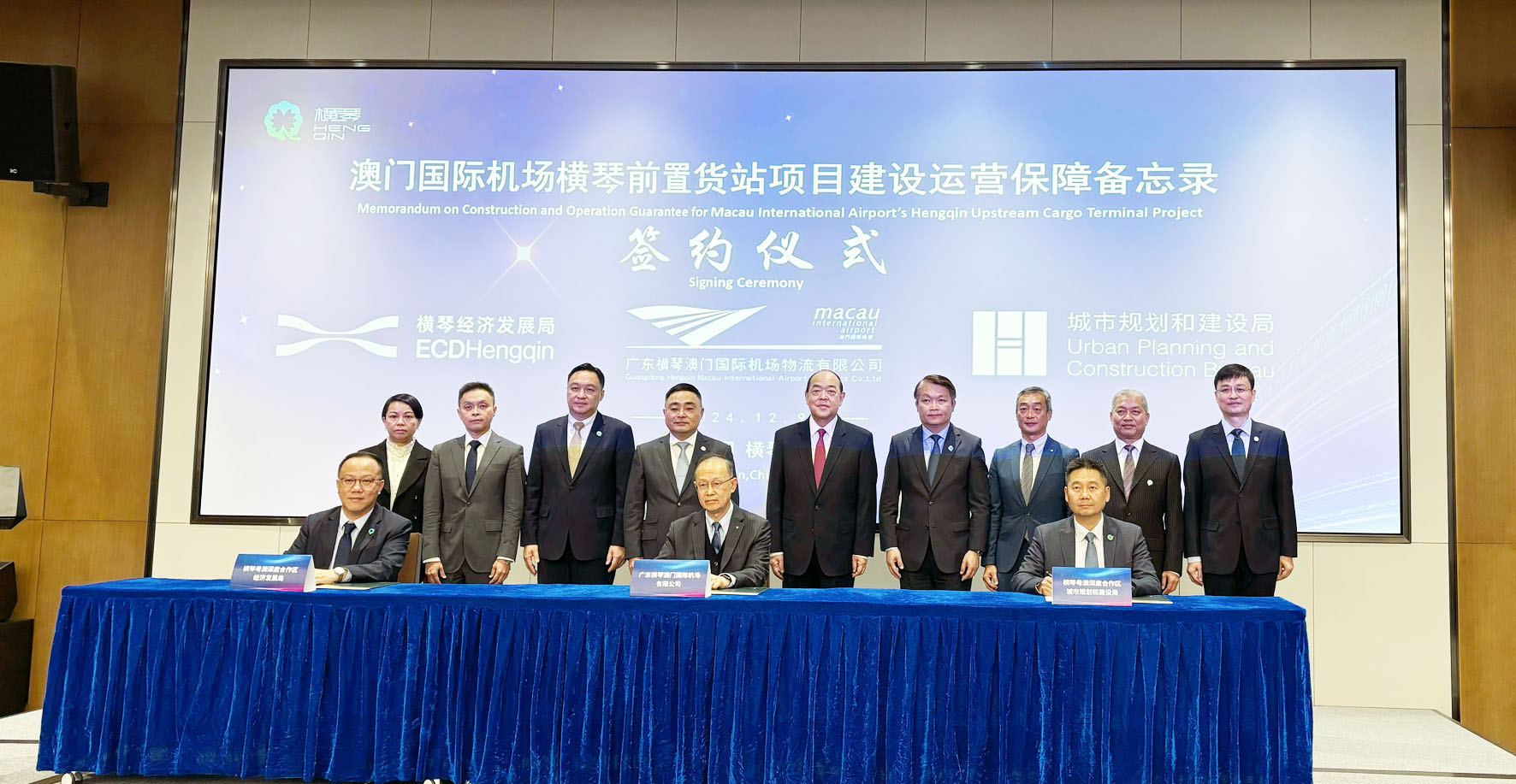 在行政長官、橫琴粵澳深度合作區管理委員會主任賀一誠,經濟財政司司長、深合區執委會主任李偉農,中國遠洋海運集團副總經理、黨組成員林戟,澳門國際機場專營股份有限公司執行委員會主席陳穎雄,廣東省委橫琴工委委員、深合區執委會副主任符永革,深合區執委會副主任蘇崑,澳門民航局局長潘華健,中遠海運物流供應鏈有限公司董事長、黨委書記紀海東,澳門海關口岸監察廳廳長吳嘉慧見証下,深合區經濟發展局局長李子蔚與深合區城市規劃與建設局局長張國基,以及廣東橫琴澳門國際機場物流有限公司董事長、法定代表人李時泰在現場簽署工程建設營運保障備忘錄,宣佈工程正式啟動。