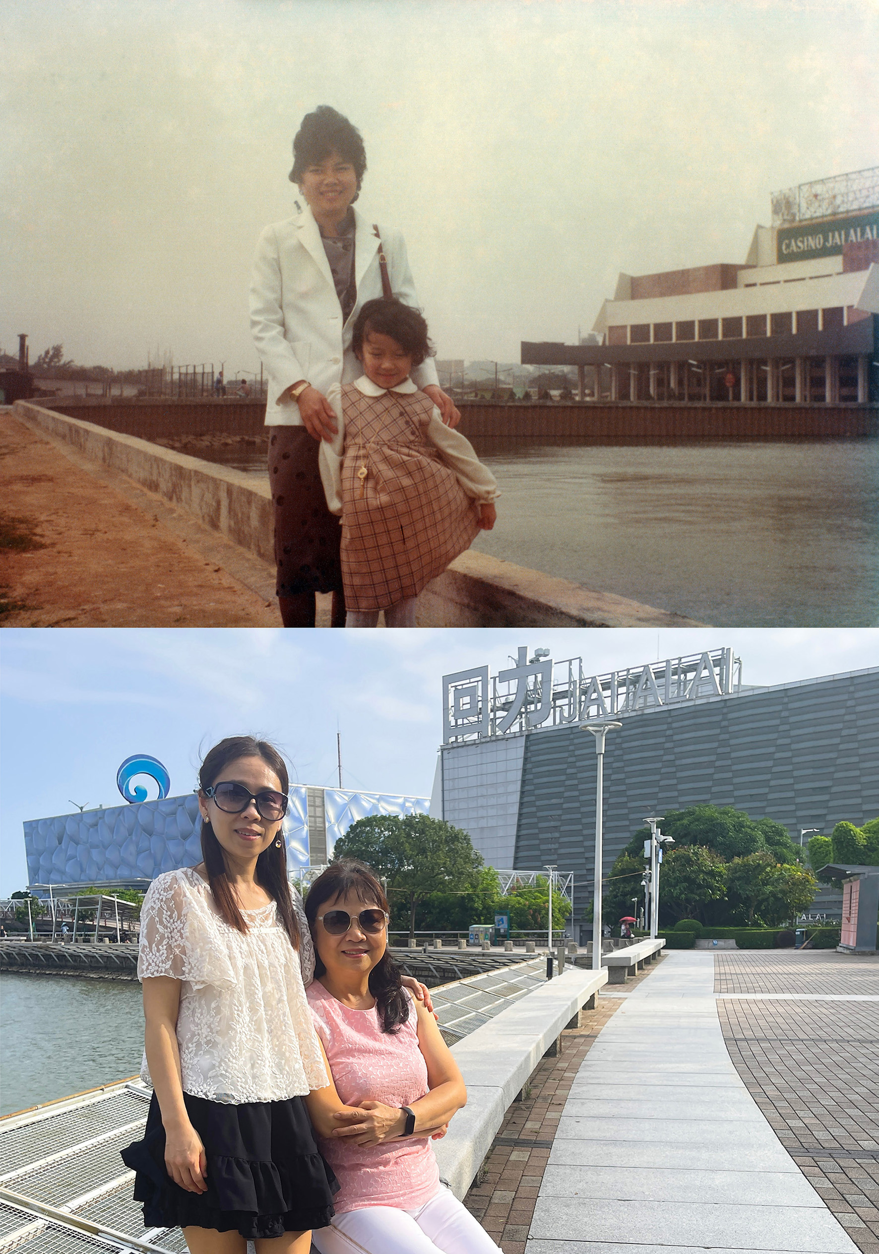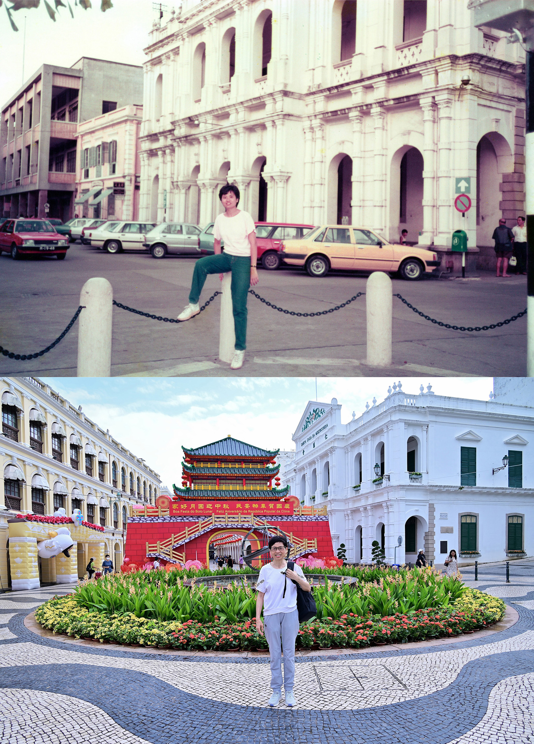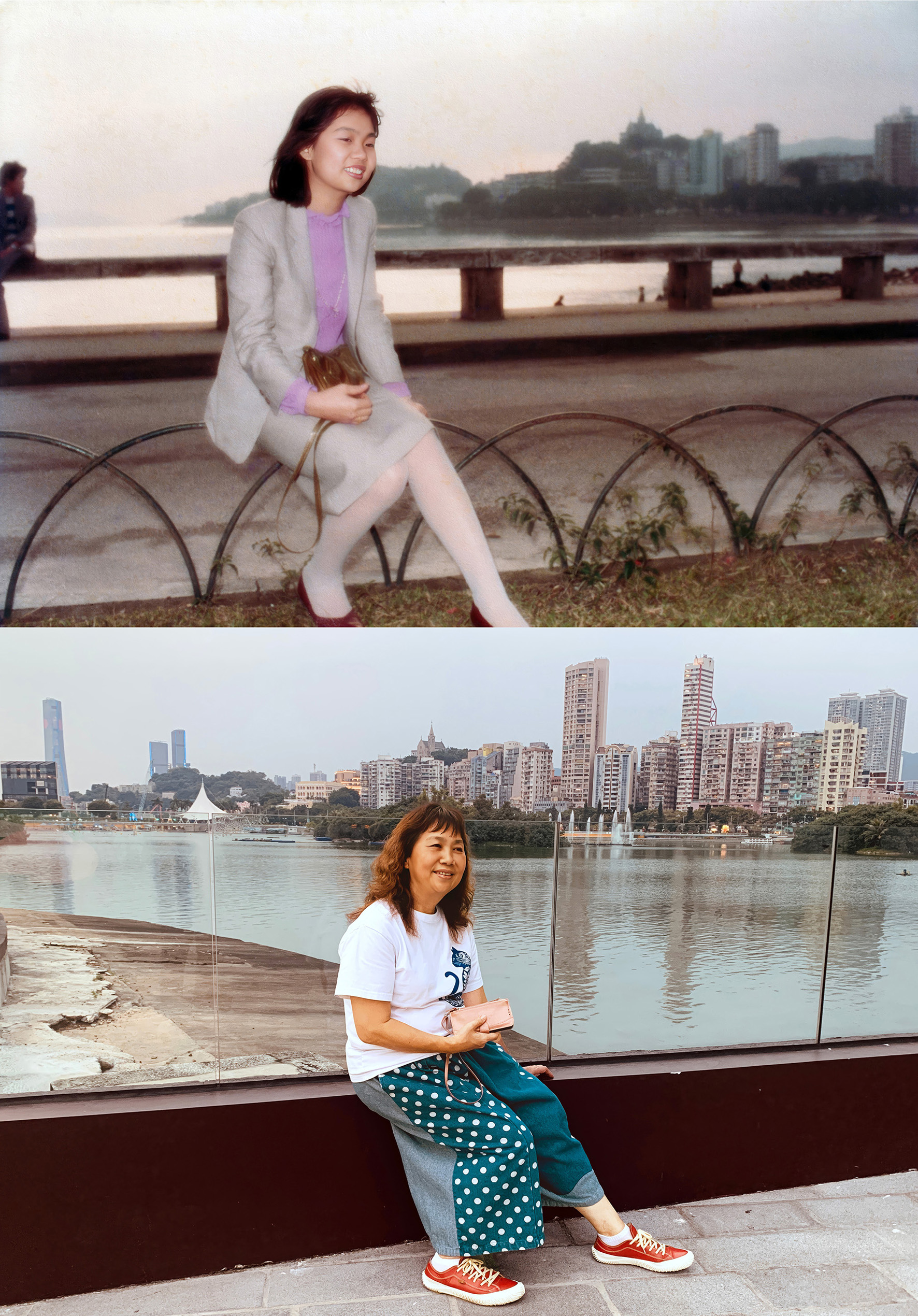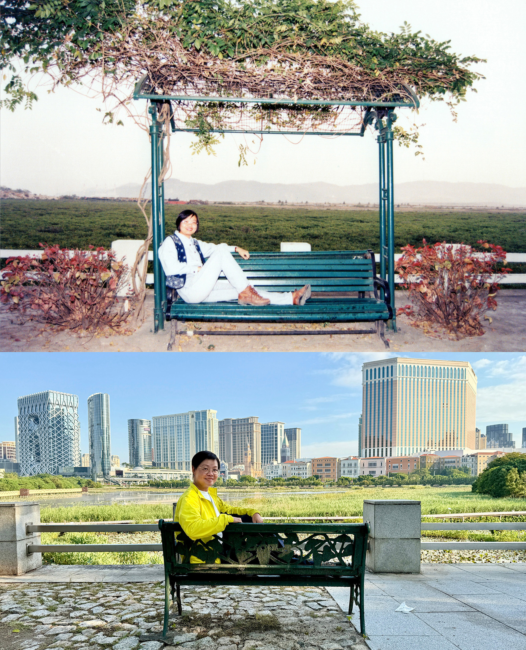 馮瑞芳提供的一組相片取景於龍環葡韻,舊照拍攝於1983年。相片中原本是一片茂密的紅樹林,如今已蛻變為金光大道。這片曾經開闊的自然景觀,現已發展成為林立著眾多大型綜合休閒企業的現代化區域,充分展現了澳門賭權開放後的經濟飛速發展成果。