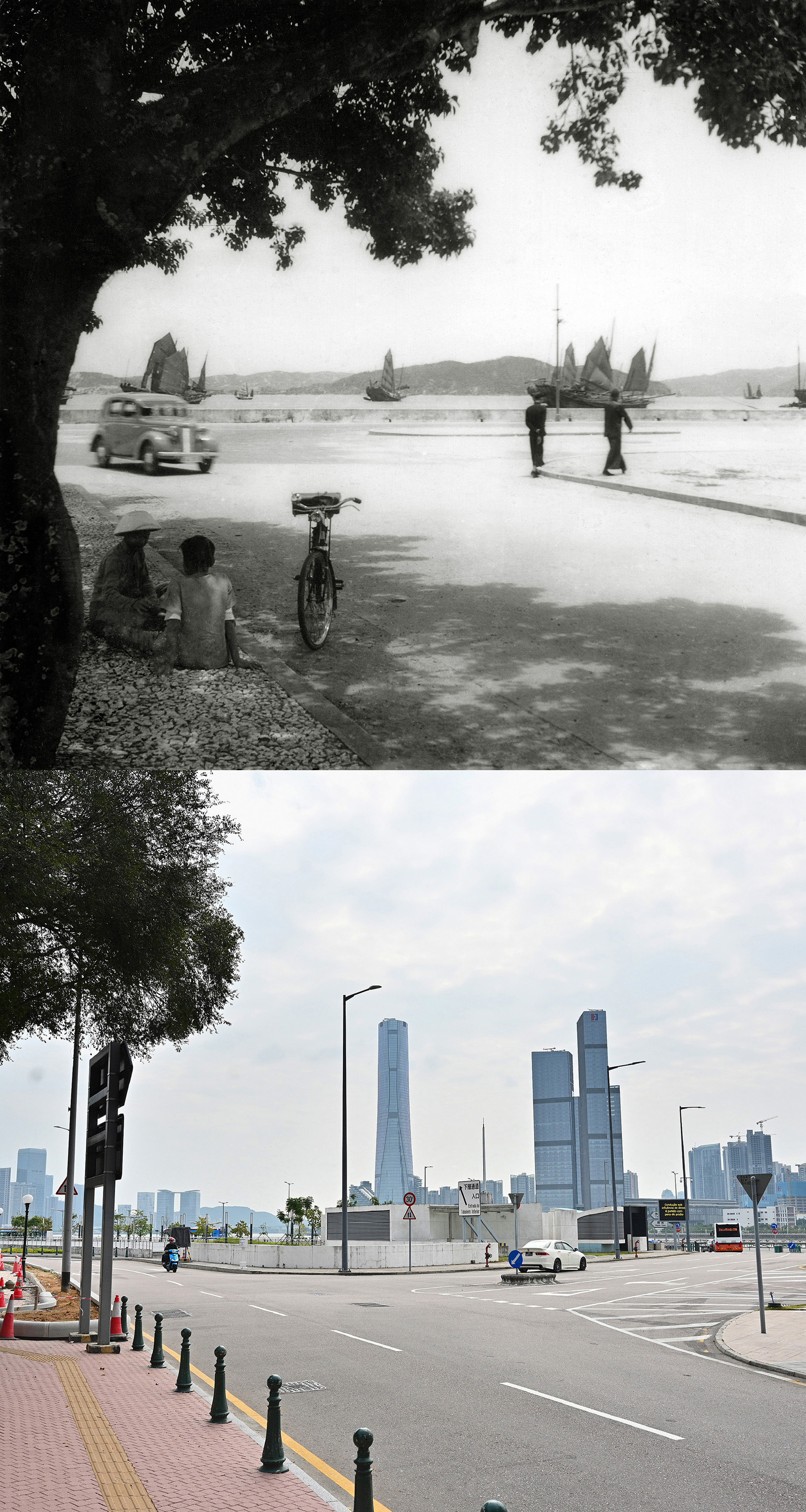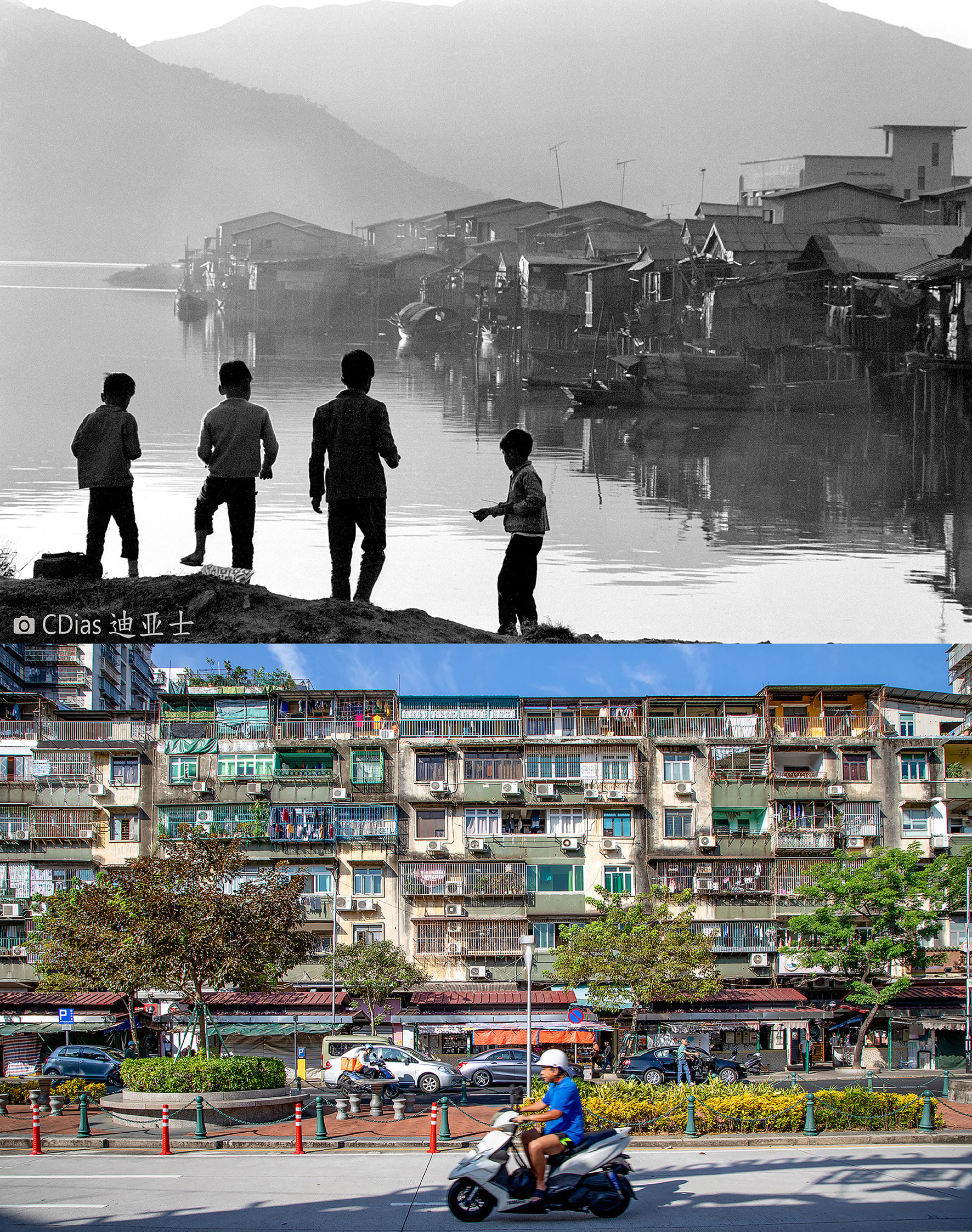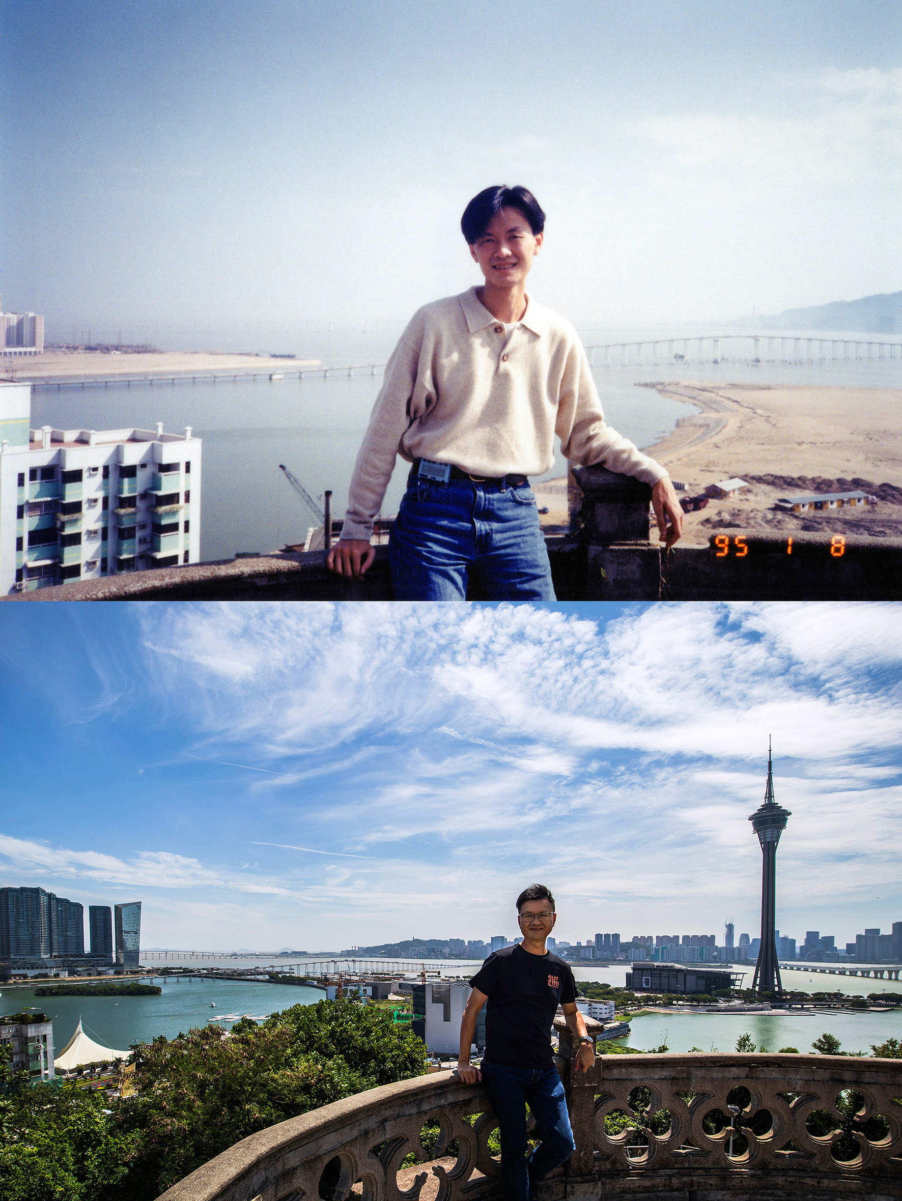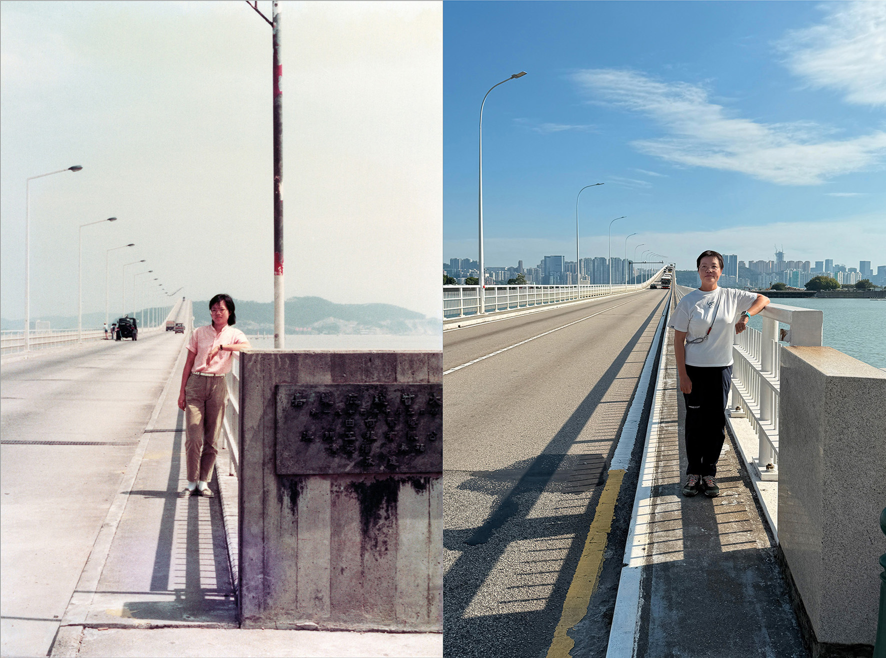馮瑞芳提供的一組相片取景於龍環葡韻,舊照拍攝於1983年。相片中原本是一片茂密的紅樹林,如今已蛻變為金光大道。這片曾經開闊的自然景觀,現已發展成為林立著眾多大型綜合休閒企業的現代化區域,充分展現了澳門賭權開放後的經濟飛速發展成果。