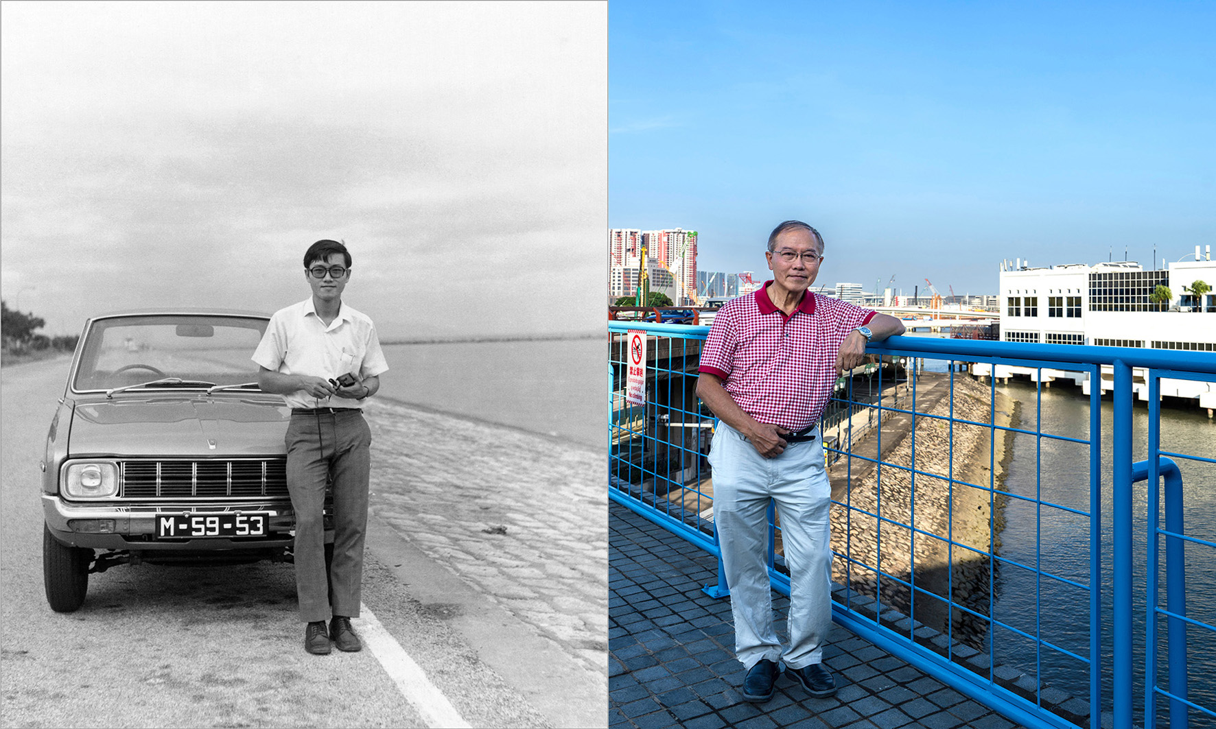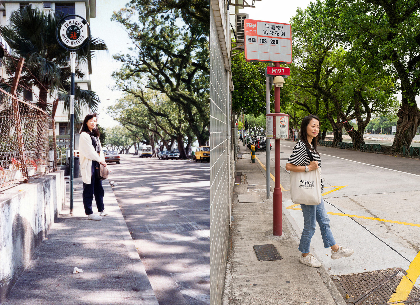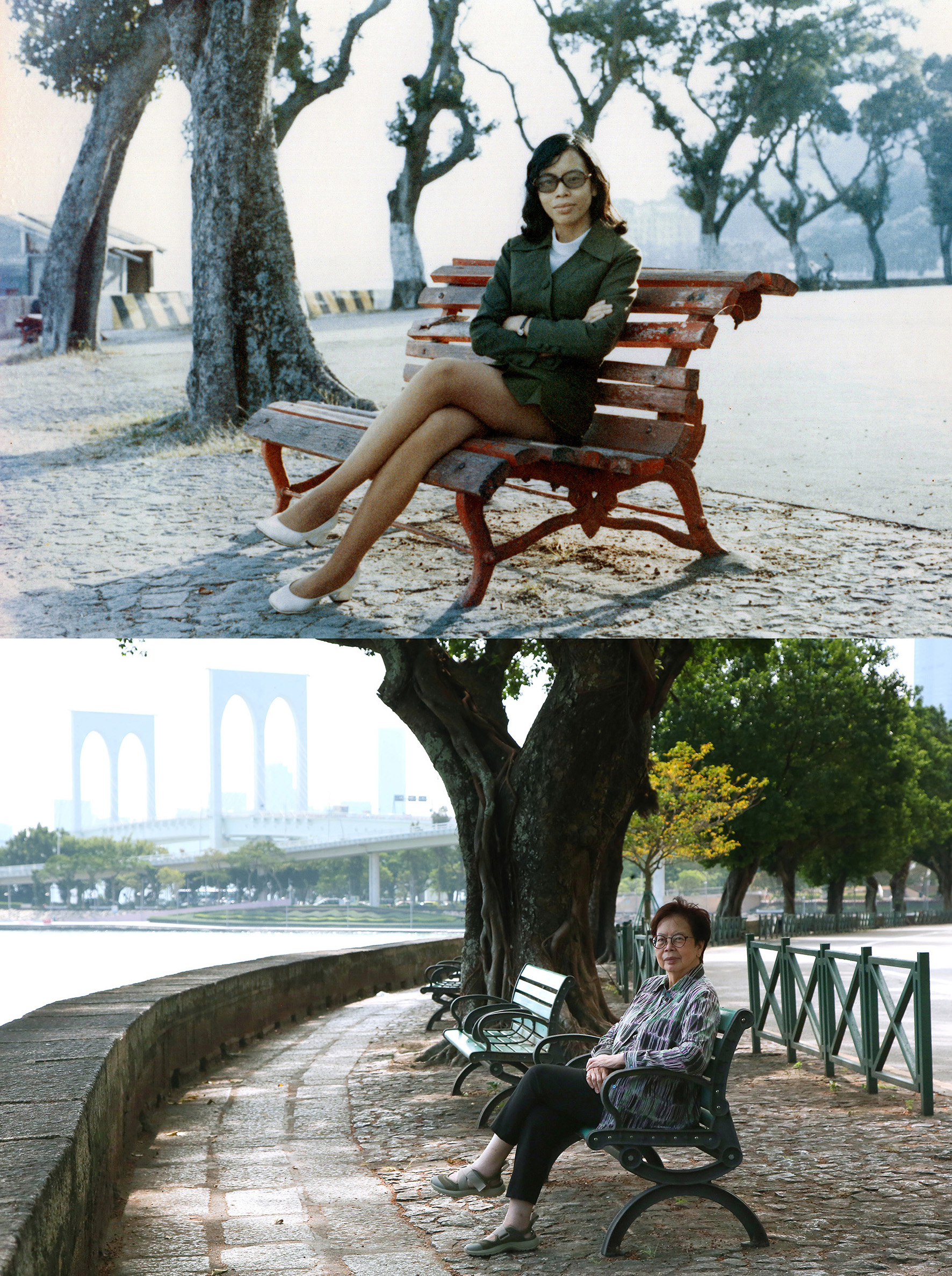 甄國富的太太林品莊提供了一組相片取景於西灣民國大馬路,同樣是1972年的舊照。半個世紀過去,照片中端坐的人儀態依舊,風采依然。她感慨地說:「西灣的海水依然流淌,昔日的石頭依然穩坐原處,默默見證著滄海桑田的變遷。休憩長椅已由紅色轉為綠色,海邊變成了行人專用區,見證了一代又一代人的足跡。」
