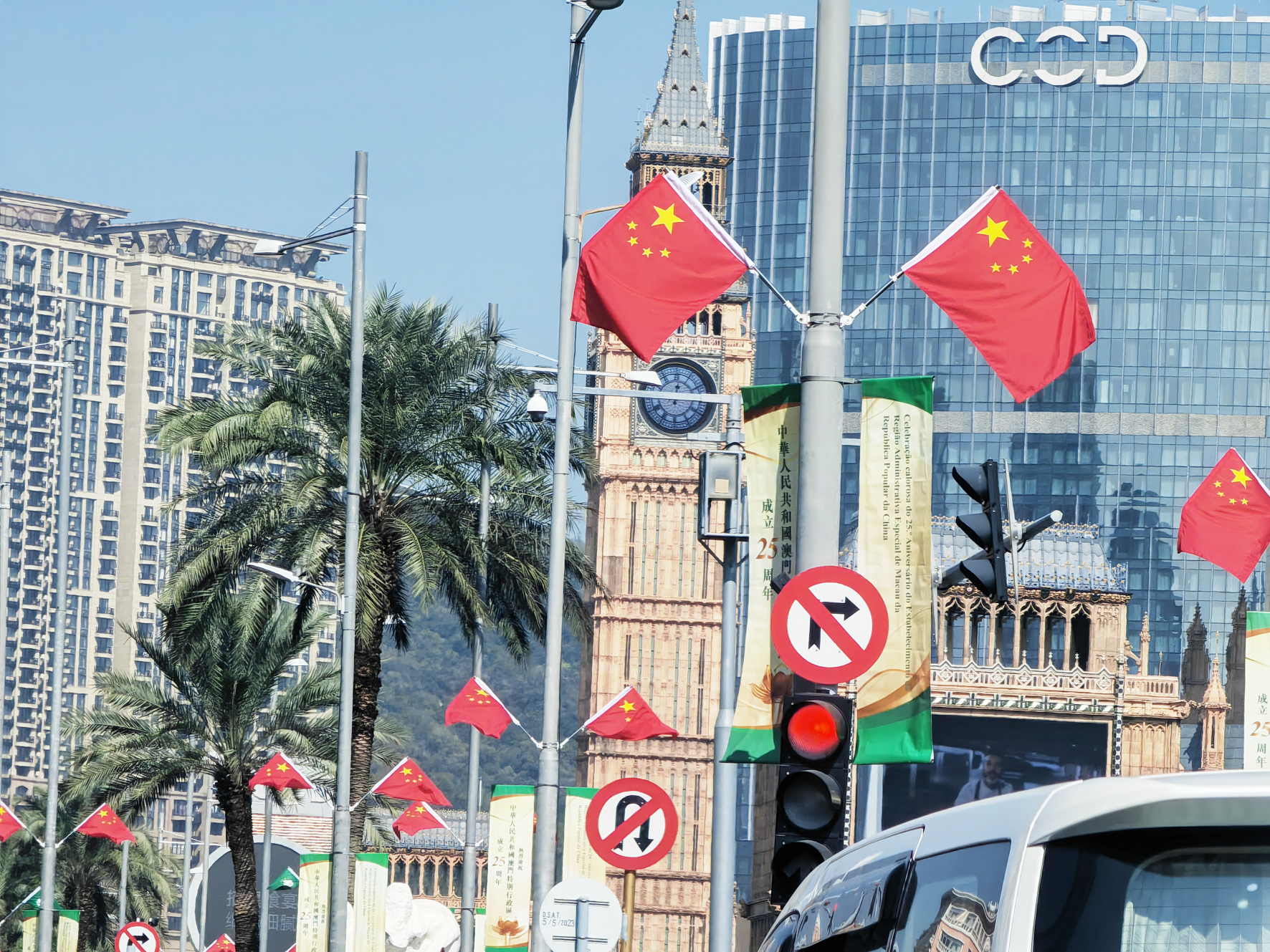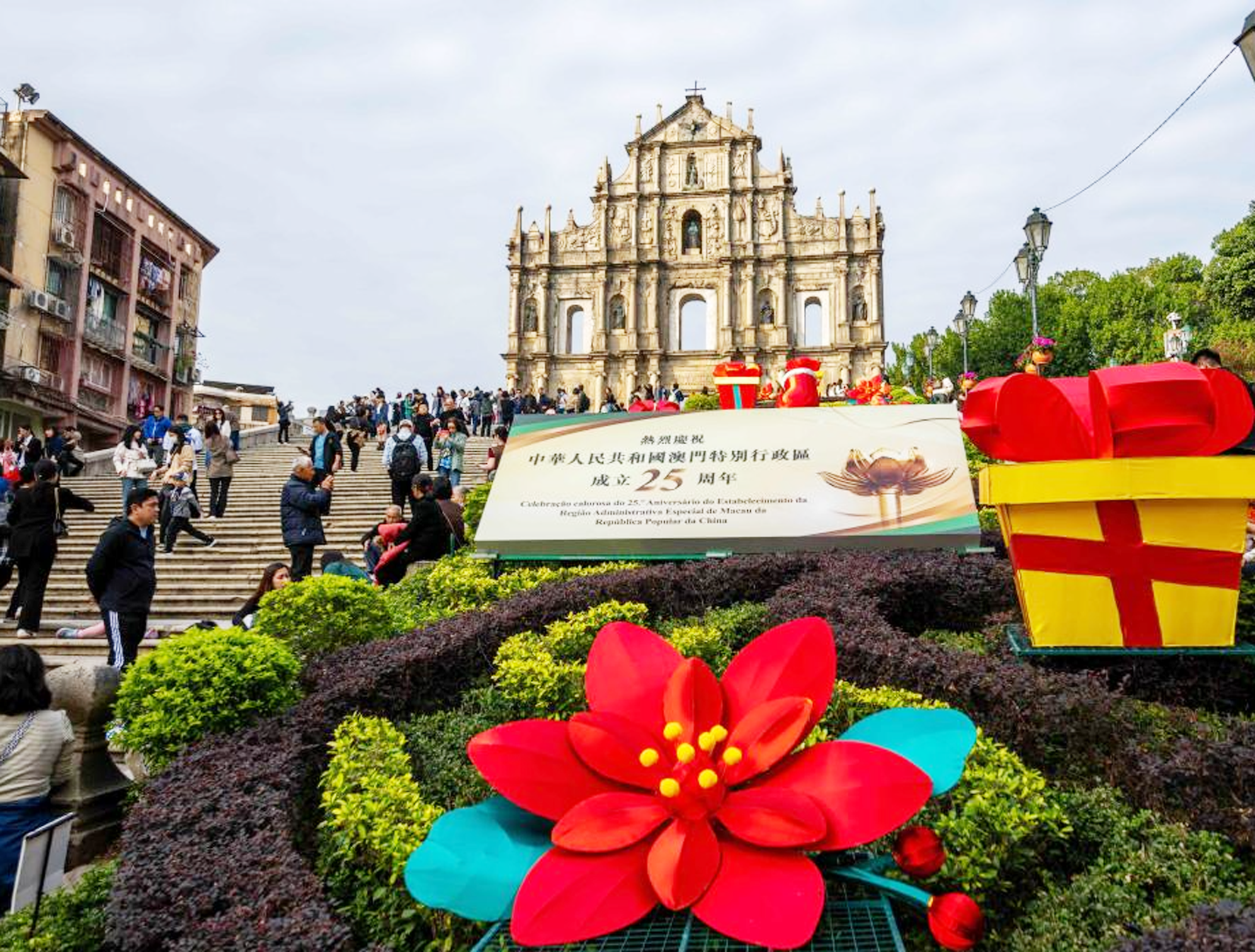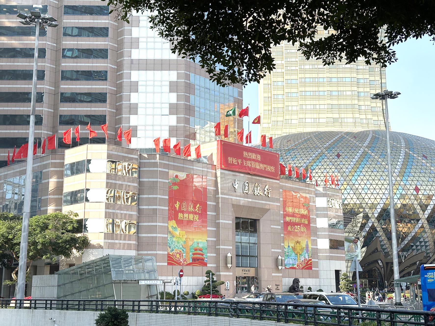 隨著澳門即將迎來回歸祖國二十五週年,全澳大街小巷被精心裝扮,主要街道的燈桿上插滿了鮮艷的五星紅旗和澳門特區區旗,迎風飄揚,各口岸以及地標景點佈置了大型燈飾和各類慶祝標語,全城沉浸在繽紛多彩的喜慶氛圍之中,尤其在國家主席主席習近平蒞臨澳門視察的喜訊公佈後,全澳沸騰,有機構在大樓頂部懸掛「熱烈習近平主席蒞臨澳門視察」的巨大橫幅。