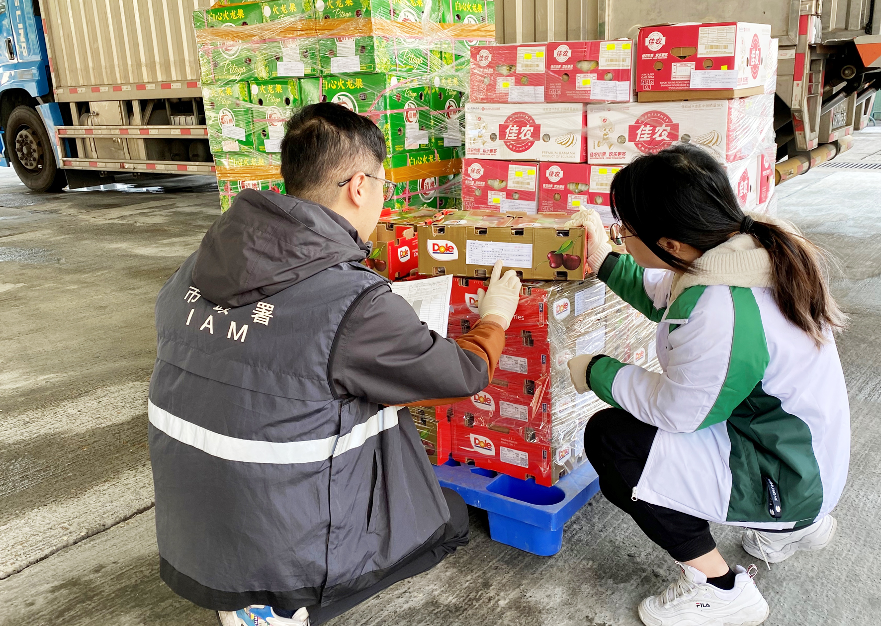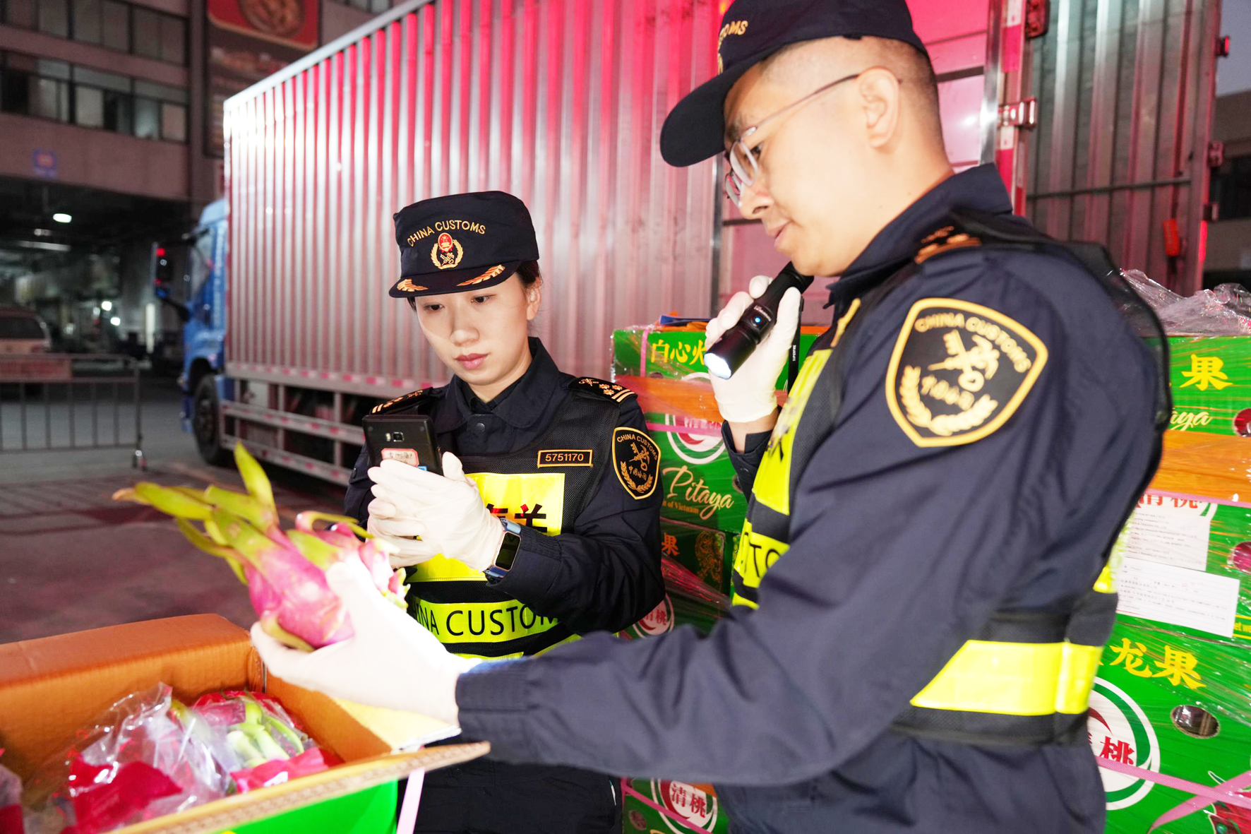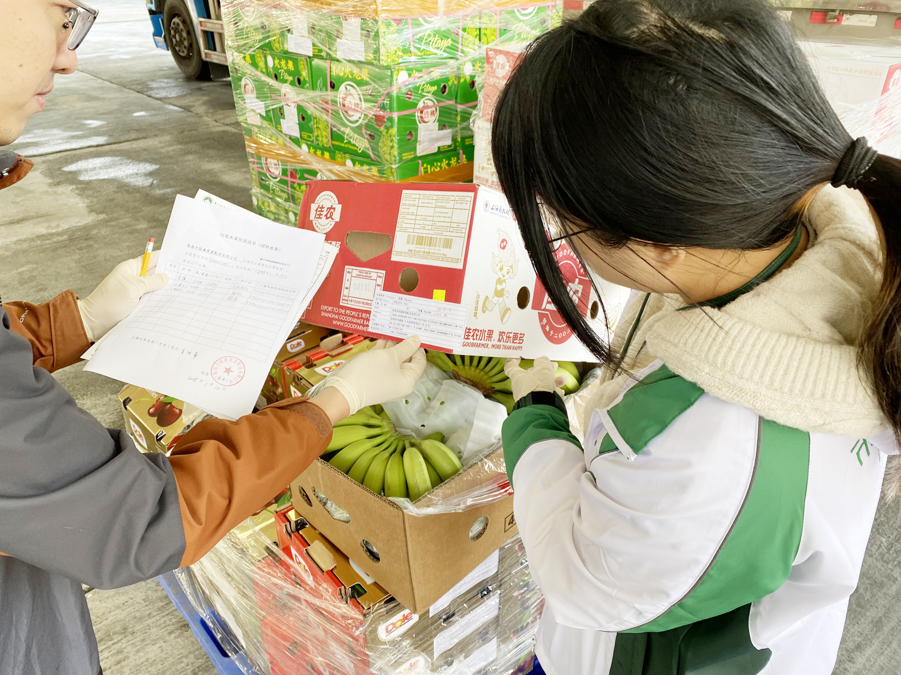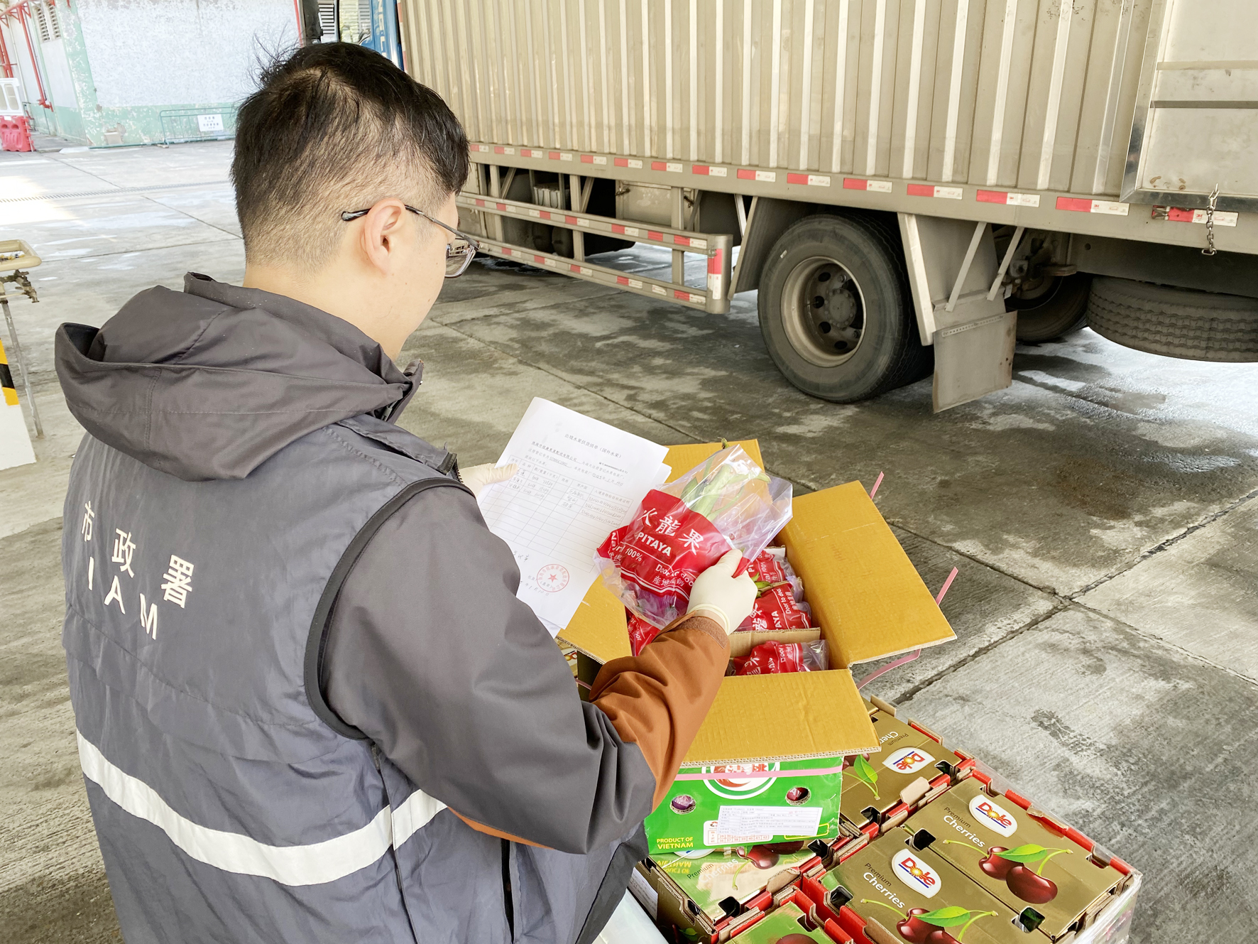 1月10日凌晨5時,新年首場寒潮剛剛南下,珠海華威路一帶卻是一片火熱,工人們正緊鑼密鼓地將來自智利、厄瓜多爾、越南等國家的車厘子、香蕉、火龍果等110件、1355公斤的水果「原箱加貼標識」後搬運上車,經香洲海關監管後,通過拱北口岸出口運往澳門,這是內地首次實現外國進口水果「再出口」至澳門,標誌著此後經拱北關區註冊登記的出境水果包裝廠均可開展內地進口的國外水果供應澳門業務。