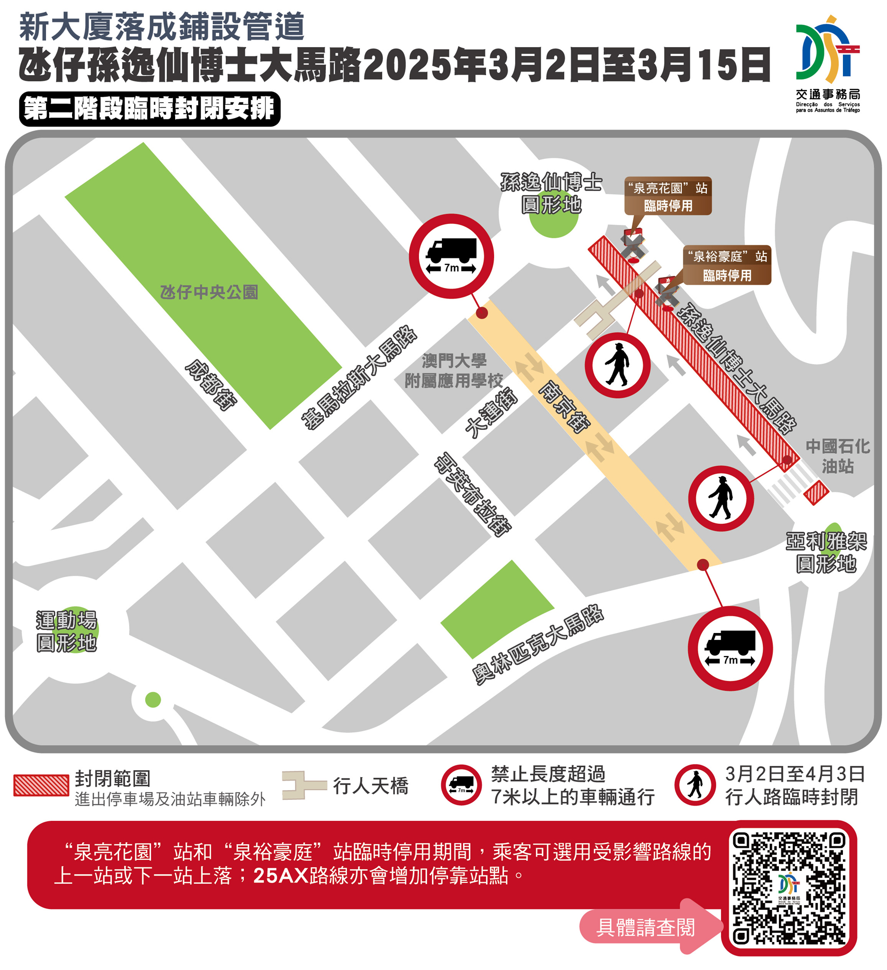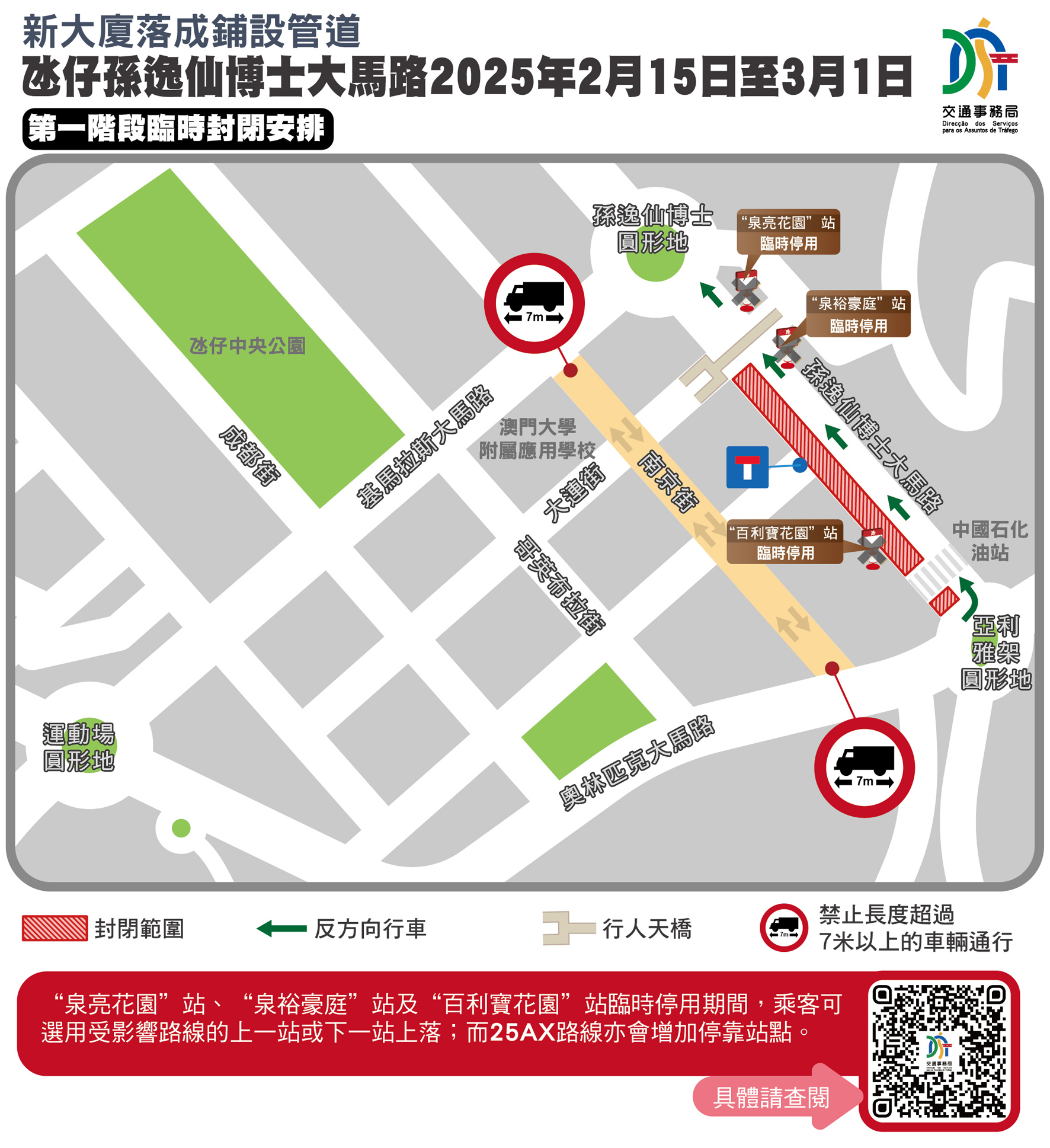 因應工程安排,首階段2月15日至3月1日「泉亮花園」站、「泉裕豪庭」站及「百利寶花園」站臨時停用,第二階段3月2日至3月15日,「百利寶花園」站恢復服務,而「泉亮花園」站和「泉裕豪庭」則繼續停用;上述兩階段期間,途經上述站點的24條巴士路線改道行經基馬拉斯大馬路及奧林匹克大馬路,其中除了25AX路線按行程方向增停「泉澧花園」 站、「氹仔茵景園」站及「信虹花園」站之外,其他相關巴士路線按原路線站點安排不變。局方亦已協調兩巴派員到受影響的巴士站,維持秩序及通知乘客相關安排,受影響的巴士線亦會增設廣播語音作提示,以進一步加強提示。