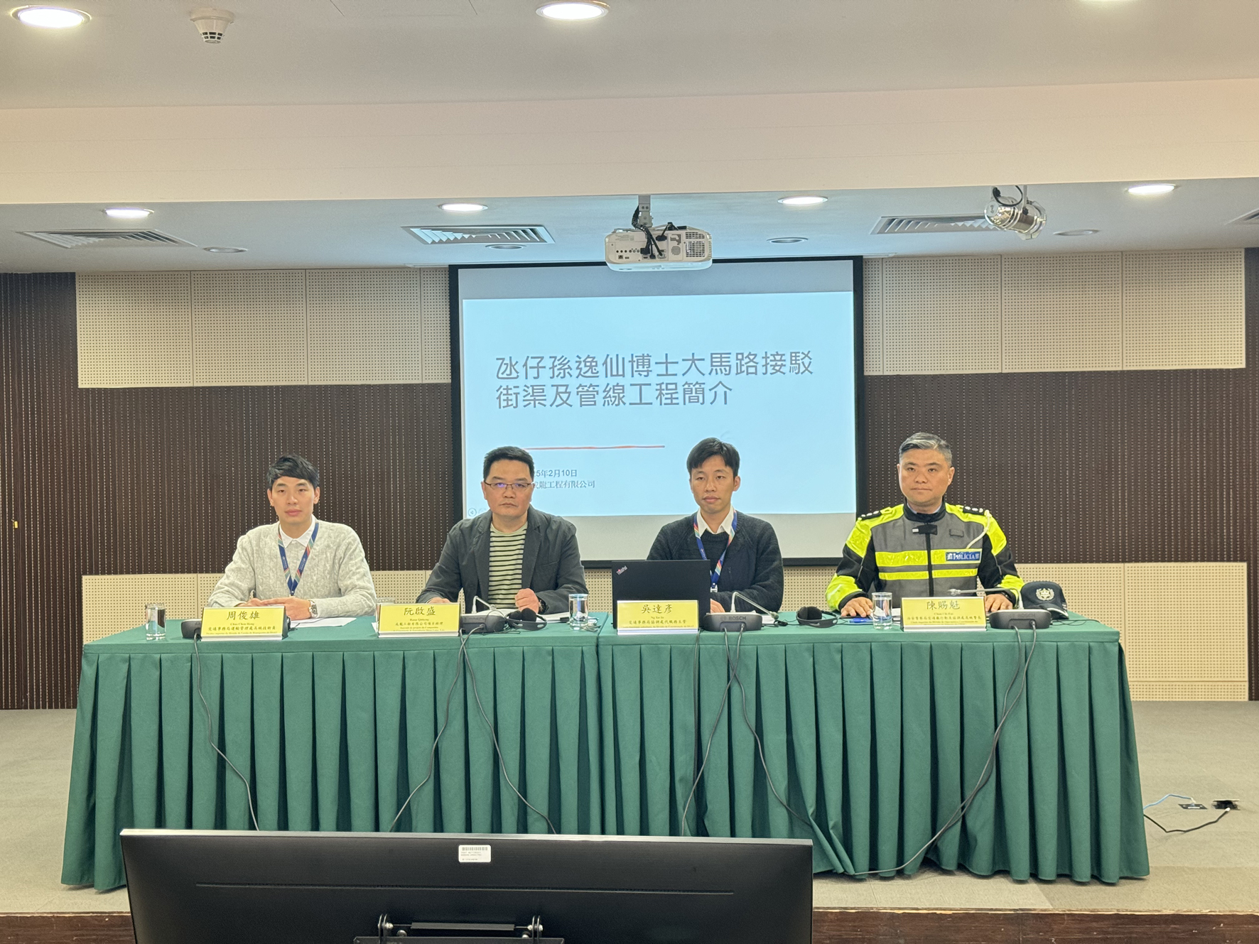 新聞發佈會昨日下午三時假馬交石炮台馬路33號五樓多功能室舉行,交通事務局協調處代職務主管吳達彥、承建商-成龍工程有限公司項目經理阮啟盛、交通事務局運輸管理處高級技術員周俊雄及治安警察局交通廳行動及協調處高級警長陳賜魁出席介紹。