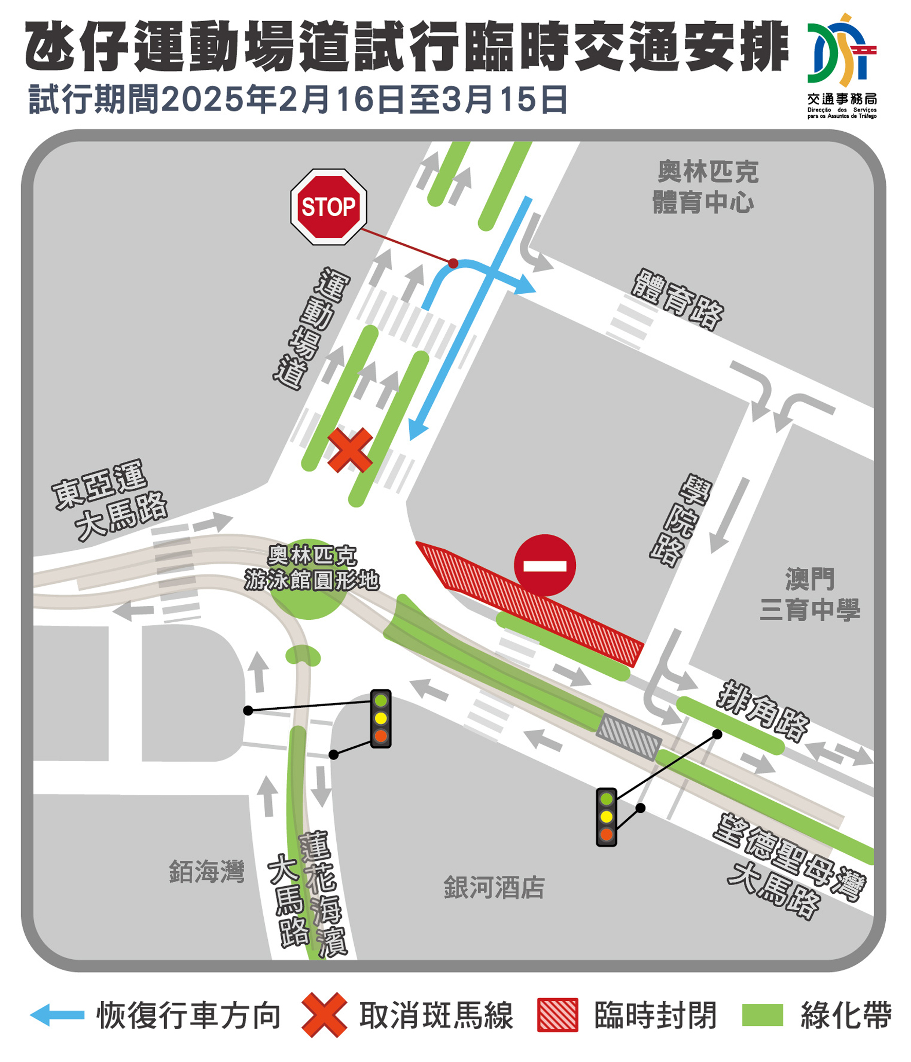 為提升周邊道路疏導能力,2月16日至3月15日臨時試行恢復運動場道往奧林匹克游泳館圓形地及運動場道(往運動場圓形地方向)右轉至體育路的行車安排,而位於運動場道與學院路之間的一段排角路將臨時封閉,運動場道鄰近奧林匹克游泳館圓形地的斑馬線亦會暫停使用,市民可使用運動場道鄰近體育路的斑馬線。