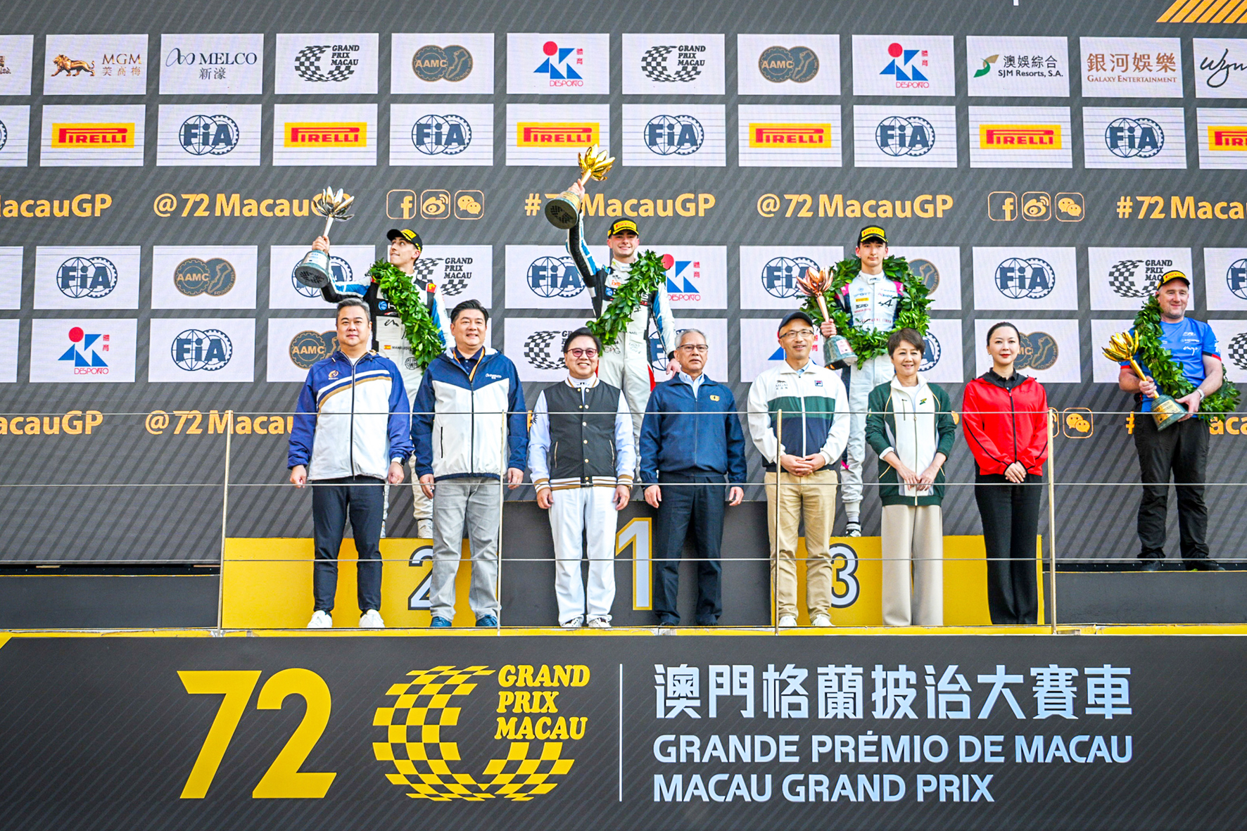 【特訊】第72屆澳門格蘭披治大賽車昨上演壓軸賽事--國際汽聯FR世界盃。經過激烈的競逐,最終6號法國車手奈爾在最後時刻「爬頭」率先衝線,贏得冠軍,原本領先的7號西班牙車手寶雅落到第二獲得亞軍,另一名5號法國車手迪利尼則摘得季軍,其後行政長官岑浩輝向賽事三甲車手頒發獎盃,並與支持本屆大賽車的各休企代表合影留念。