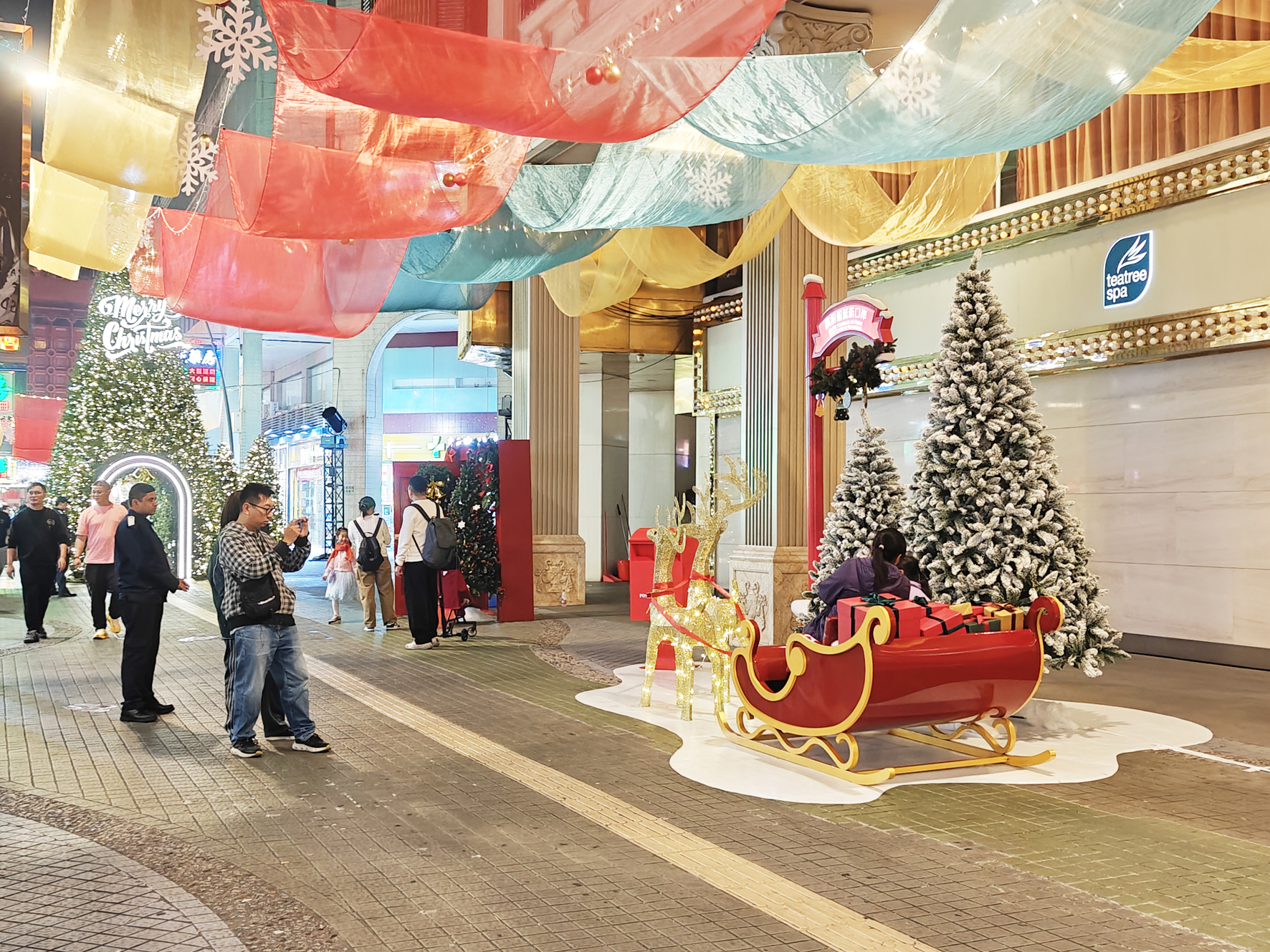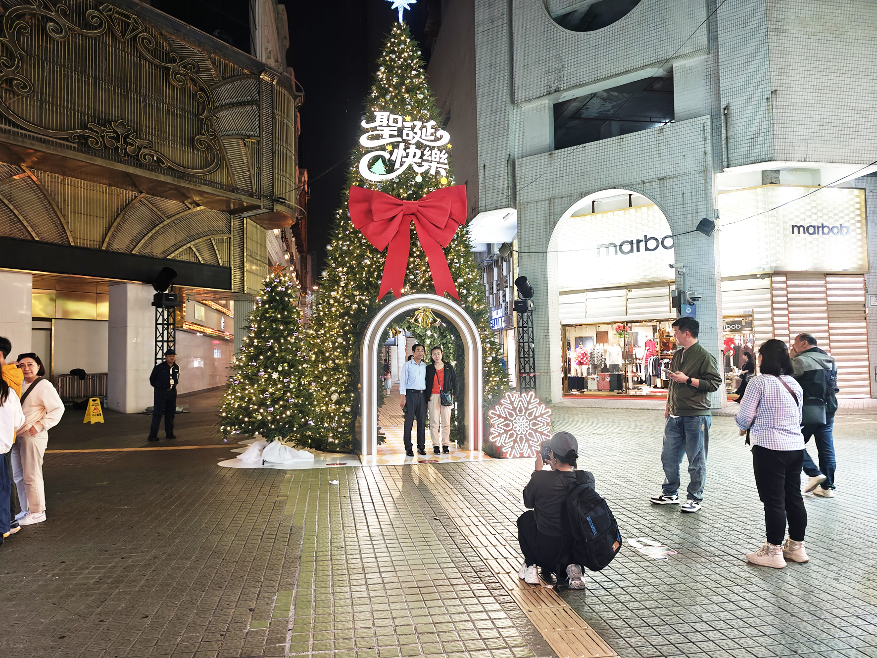 昨日為「繽紛聖誕新口岸」活動舉行的次日,新口岸廣州街至北京街一帶人流熙攘,璀璨的聖誕樹、可愛的聖誕老人馴鹿坐騎等互動裝飾成為打咭熱點,亦有充滿童趣的遊戲攤位和工作坊,每個角落都洋溢著歡樂氛圍。工作人員沿街舉牌推廣優惠活動,主動招攬顧客,形成假日消費熱潮。