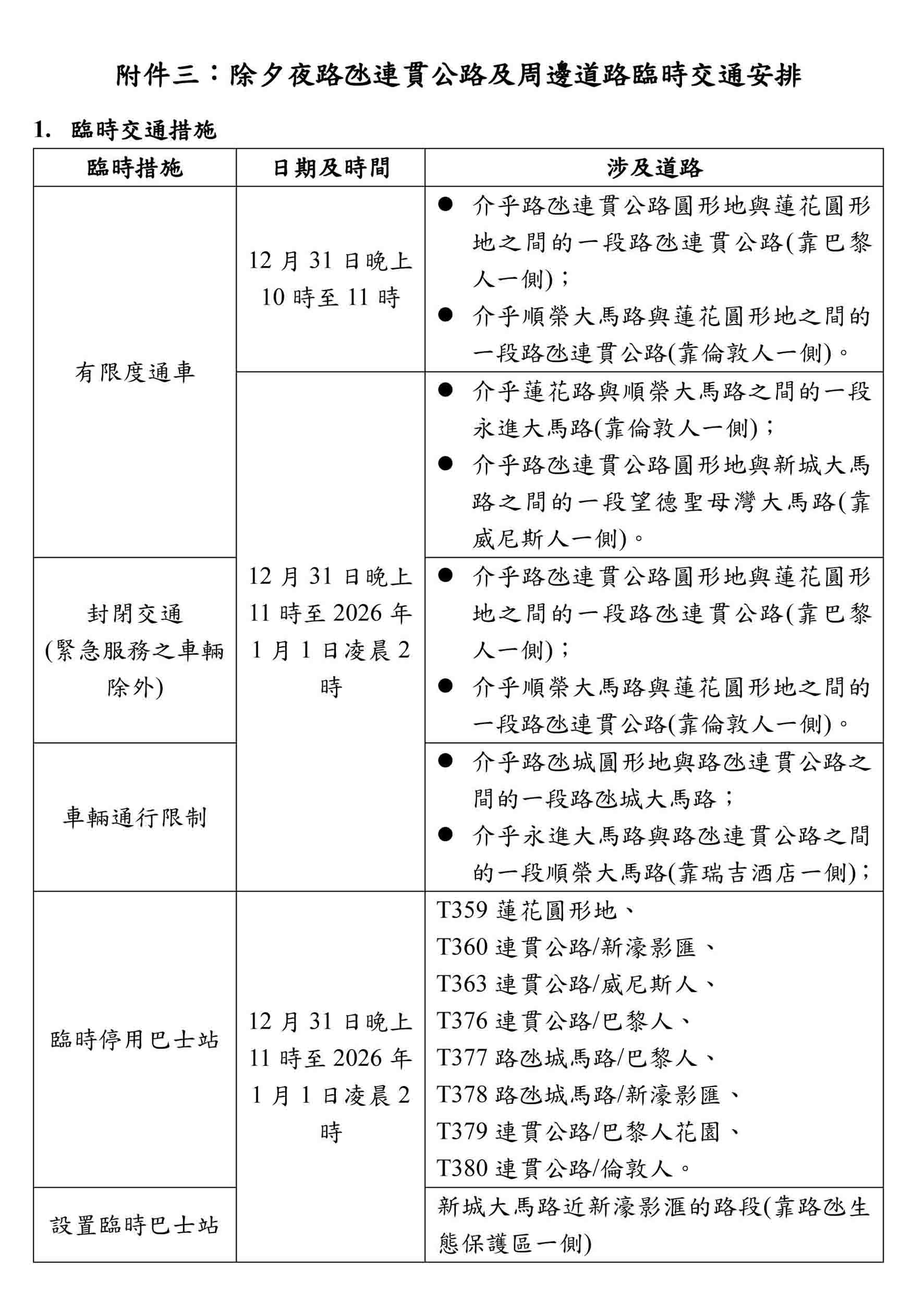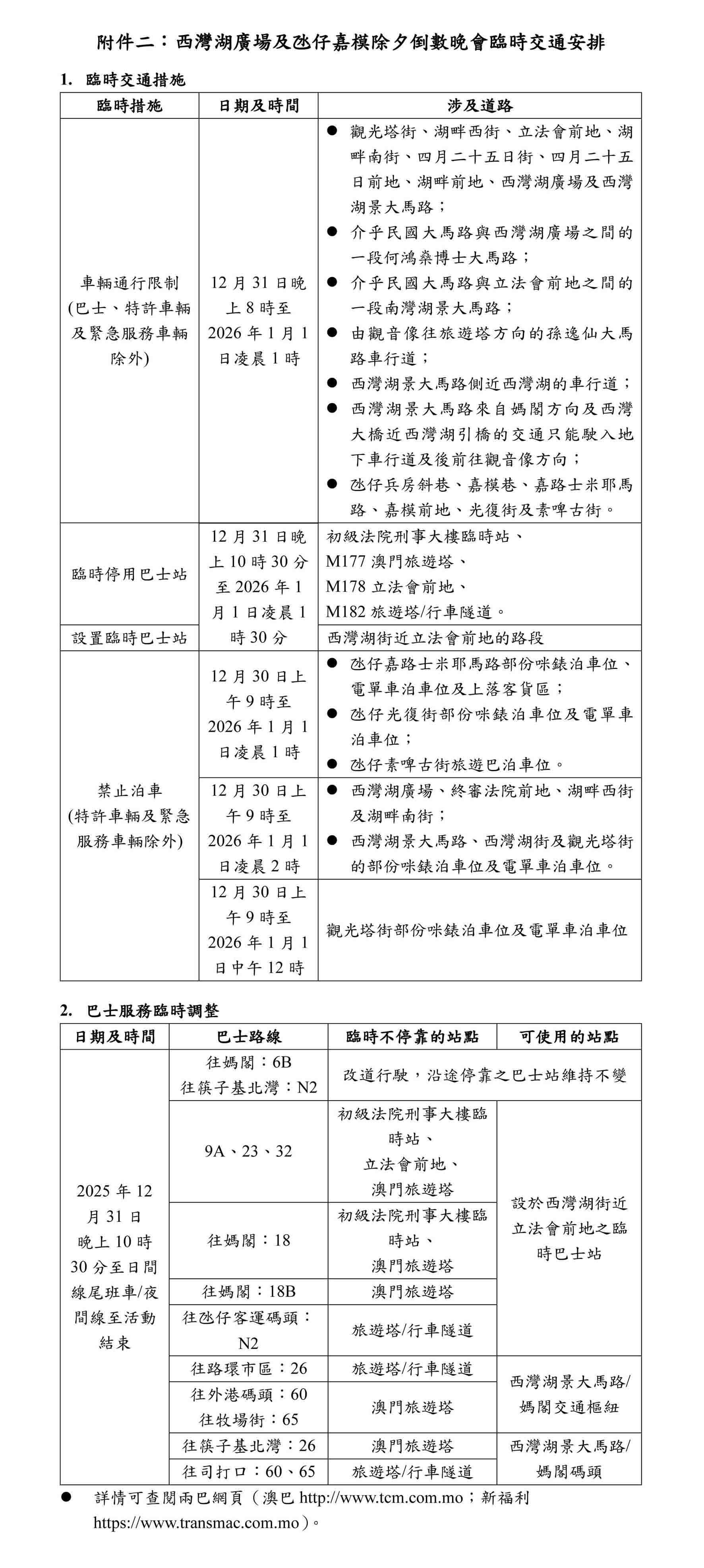 因應西灣湖廣場、氹仔龍環葡韻及金光大道分別舉行除夕晚會及倒數活動,12月31晚上8時至元旦日凌晨時段,西灣湖廣場一帶、氹仔嘉模周邊道路及路氹連貫公路均會實施道路通行限制,部份巴士站點和旅遊塔的士站將臨時調整,途經之多條巴士路線改道行駛及調整停靠站點,詳情可查閱附件二及附件三。