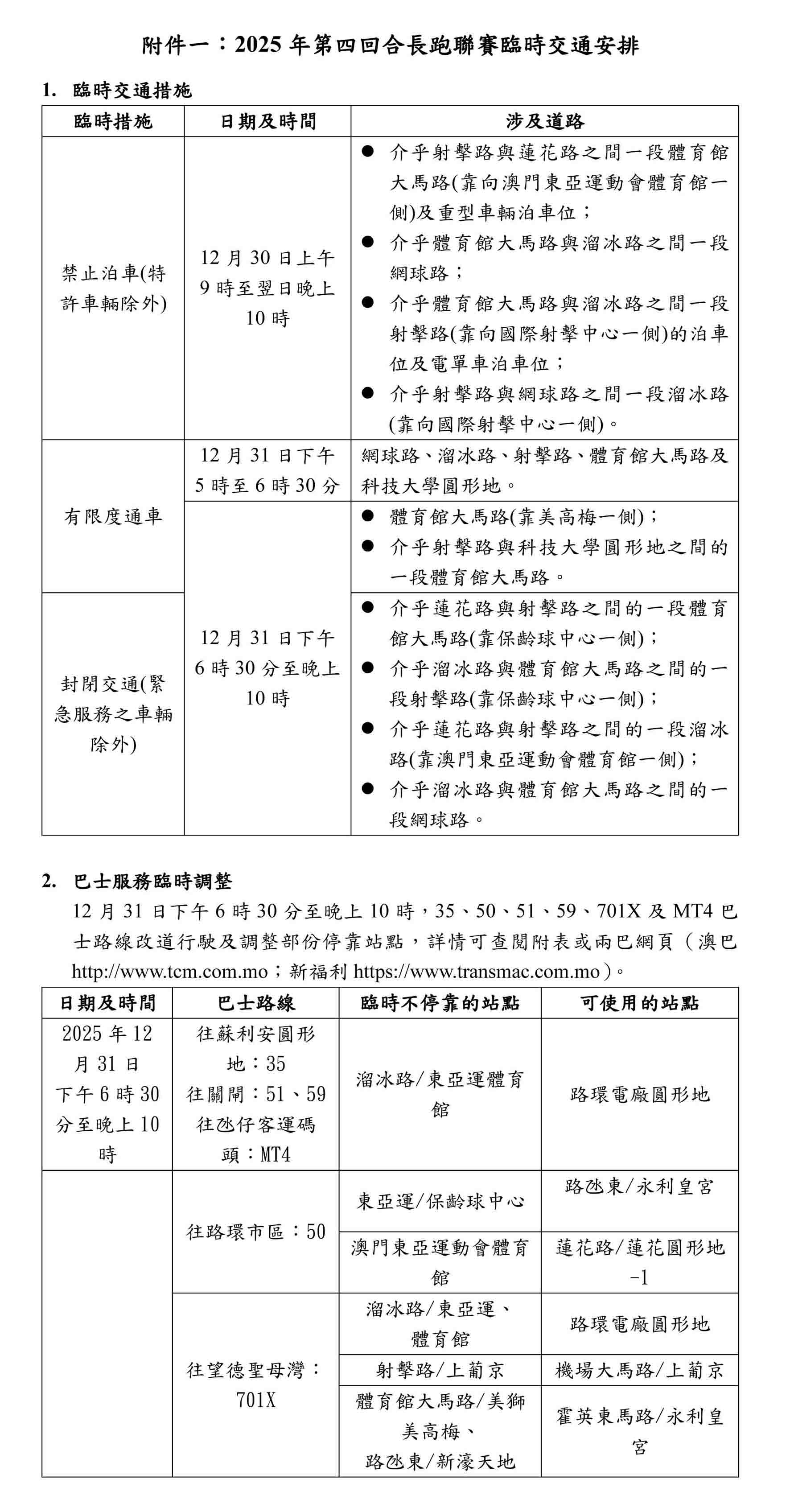 因應體育局舉辦第四回合長跑聯賽,12月 31日下午5時至晚上10時,路氹網球路、溜冰路、射擊路、體育館大馬路及科技大學圓形地一帶道路臨時實施封閉交通或有限度通車,巴士臨時改道行駛及調整停靠站點,詳情可查閱附件一。