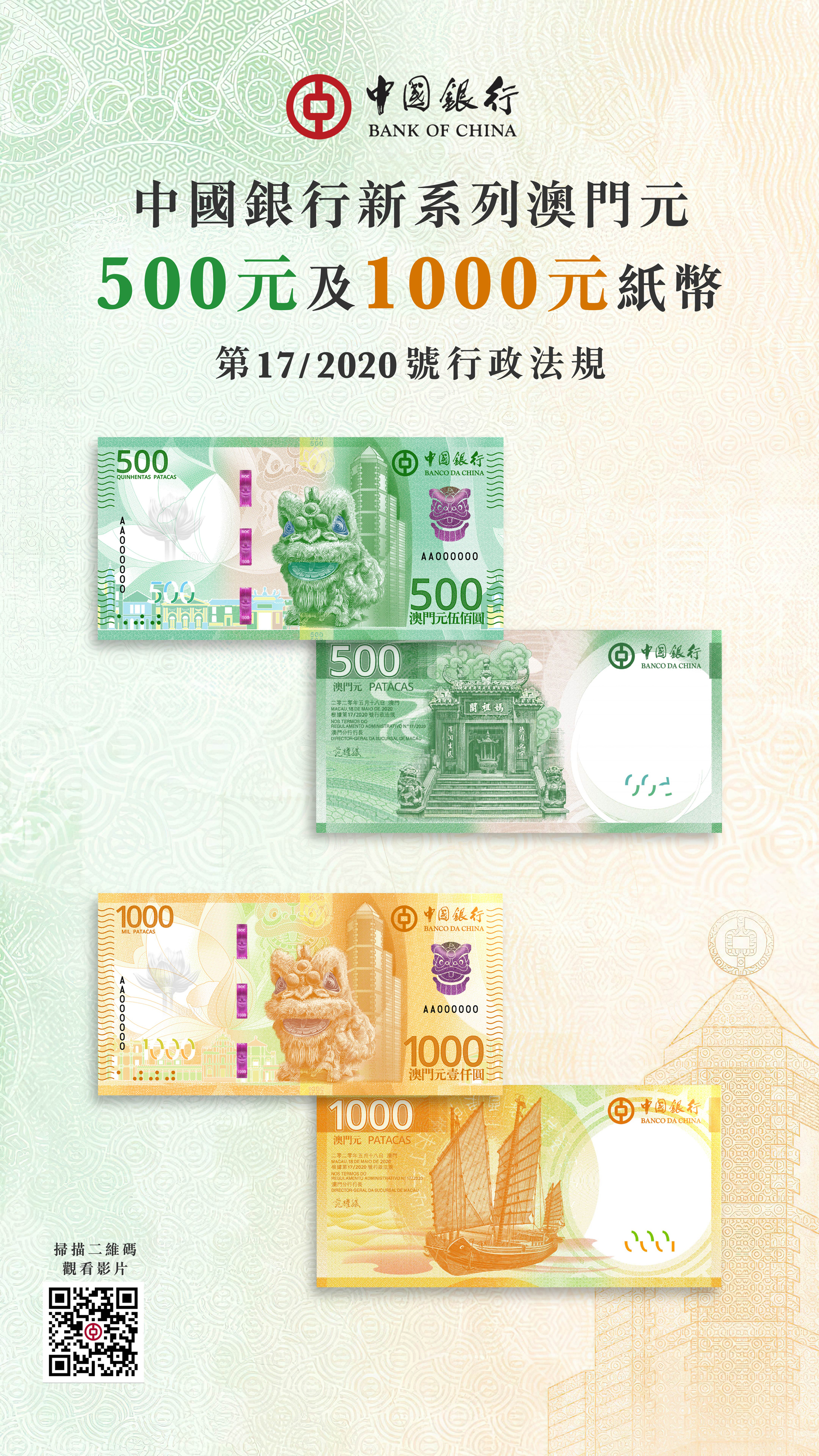 【特訊】中國銀行新系列澳門元紙幣500元及1000元於本年二月六日正式推出市面流通,連同2024年起陸續發行的10元、20元、50元及100元,全套中國銀行新系列澳門元紙幣已全面發行和流通使用,此版紙幣在紙張製作、印製工藝、防偽特徵等方面均採用了前沿製作技術,既是國家印鈔技術的實力展示,亦是特區持續進步發展的決心呈現,代表澳門元紙幣發行的一個重要里程碑。