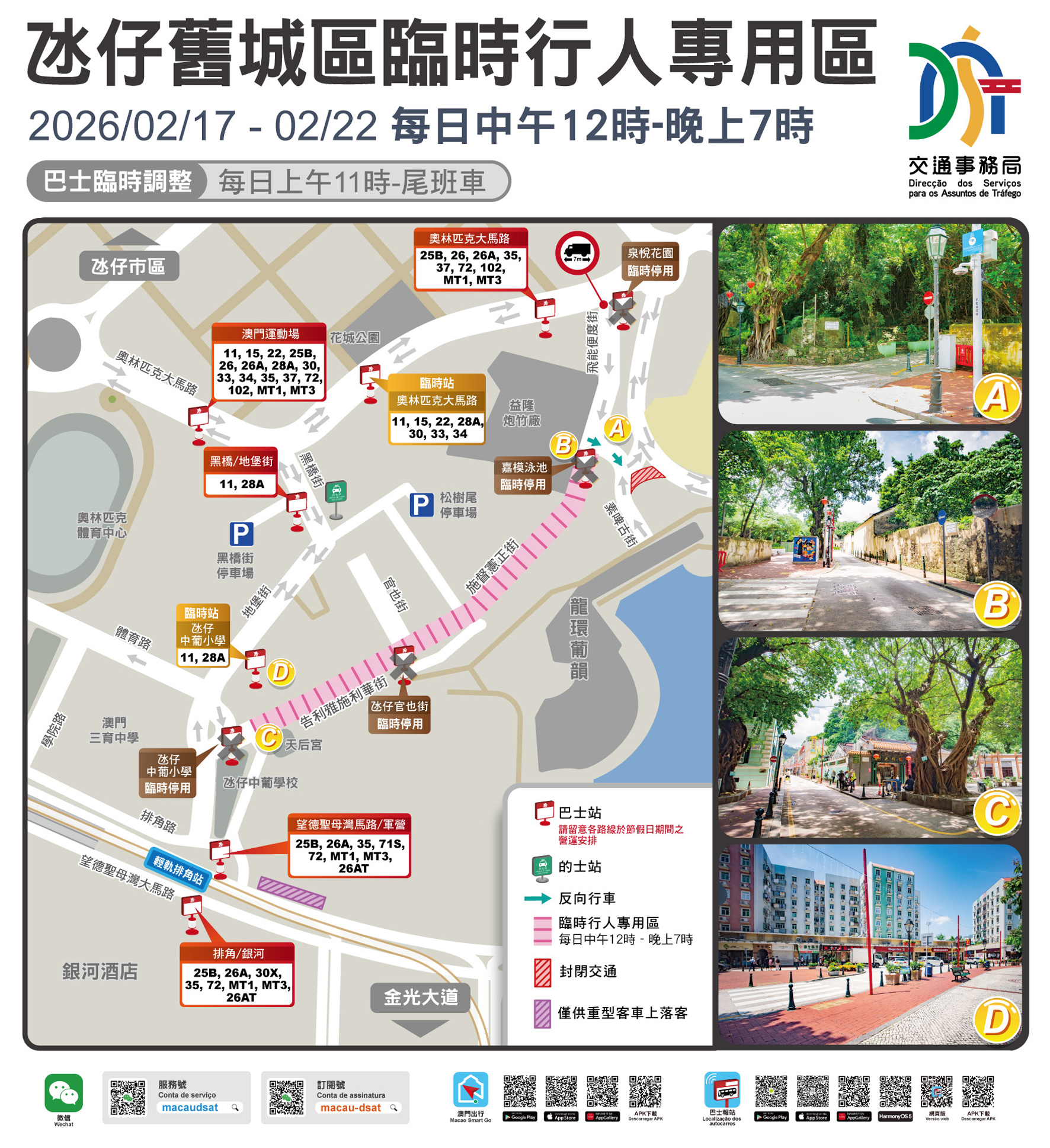 2月17日至22日,每日上午11時至尾班車期間,氹仔舊城區行人專用區範圍內的四個巴士站臨時停用,途經之多條線路需改道奧林匹克大馬路行駛,乘客可選用周邊站點或設於奧林匹克大馬路、巴波沙總督前地近氹仔中葡學校之臨時站上落;