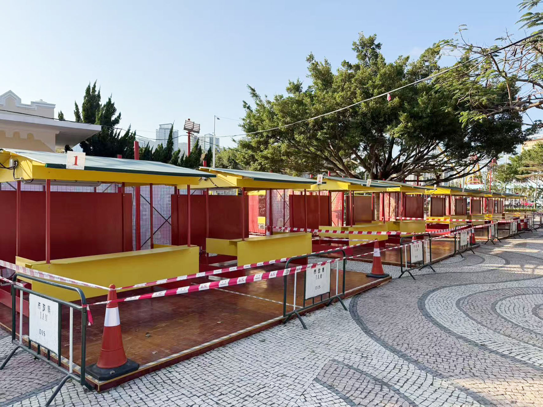 其中,媽閣廟前地海傍行人道設立十個售賣神香、風車的臨時攤檔,營業時間為今日傍晚六時至晚上十二時、2月17日(年初一)凌晨零時至傍晚六時三十分、2月18日至2月23日(年初二至年初七)早上九時至傍晚六時三十分。昨日現場所見,媽閣廟前地放置指示牌,標註售賣及燃放爆竹、煙花區域,現場攤位已準備就緒,紅色警戒線隔開攤檔,靜候攤檔開放。
