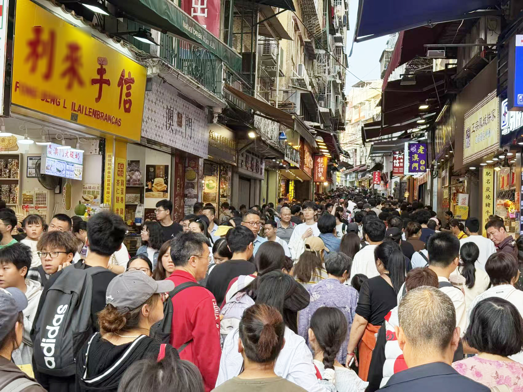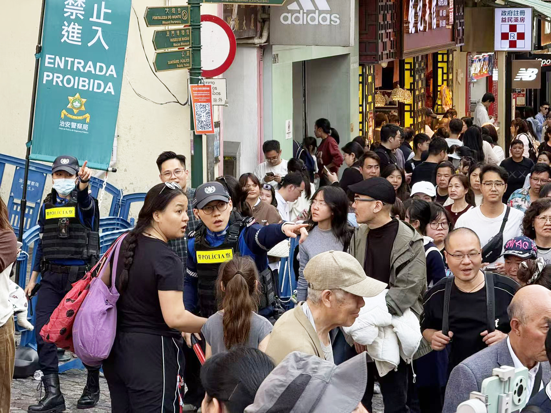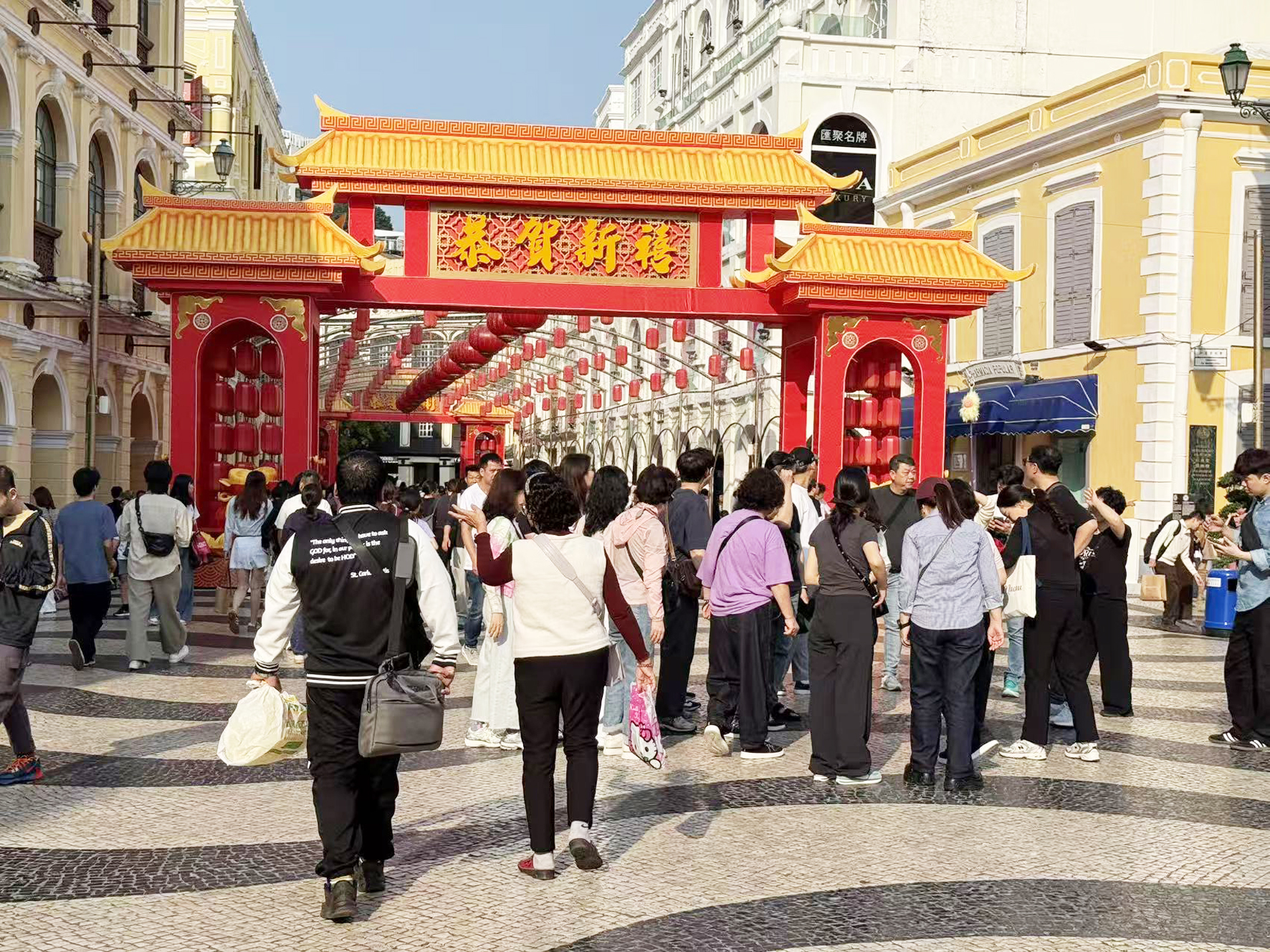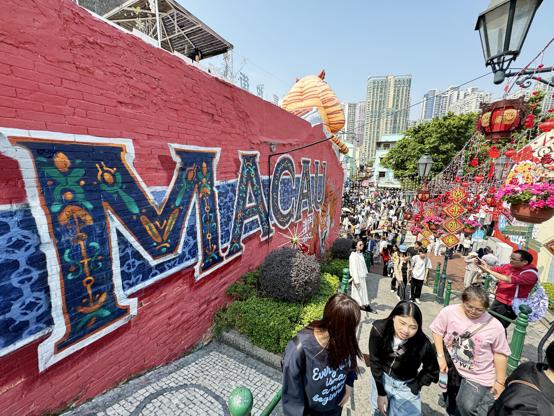 中區景區人氣爆棚,年味十足的體驗讓眾多遊客流連忘返。議事廳前地與市政署佈置的新春燈飾絢麗奪目,成為遊客打卡必到之處,家庭團聚、好友結伴的遊人紛紛駐足留影,定格新春美好瞬間。毗鄰的手信街香氣瀰漫,肉乾、杏仁餅、蛋捲等特色小吃前排起長隊,店員熱情招呼,節日氣氛撲面而來。大三巴街持續人流擁擠,警方於12:55及16:40分別實施人潮管制,行人只可單向上行前往牌坊,並取道周邊的街巷如大關斜巷、關前後街、高園街等離開。