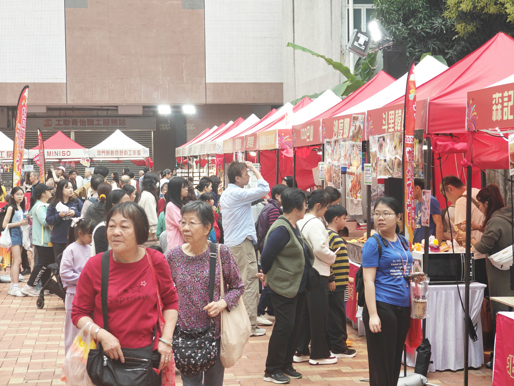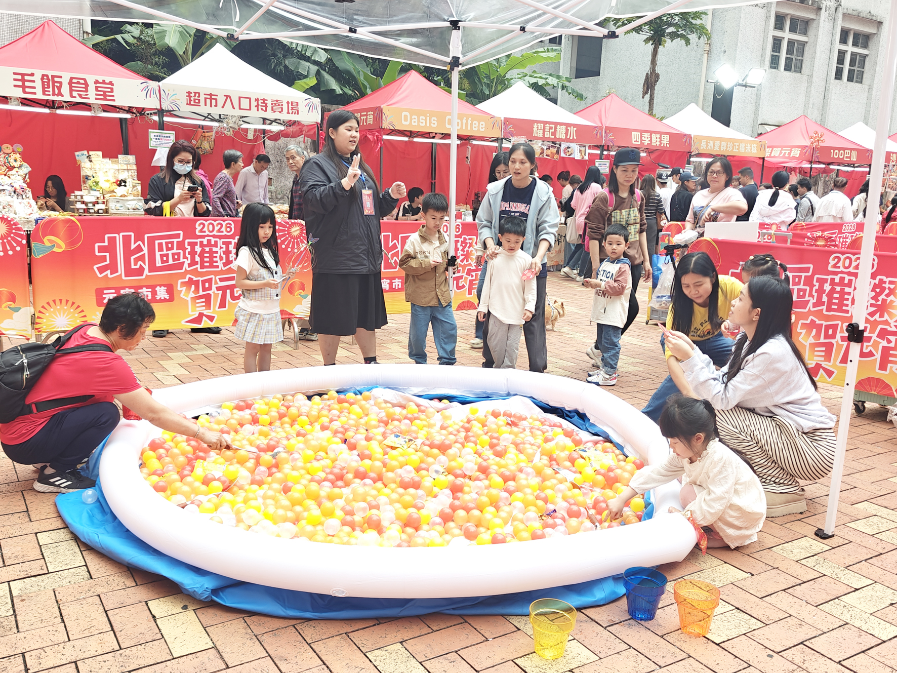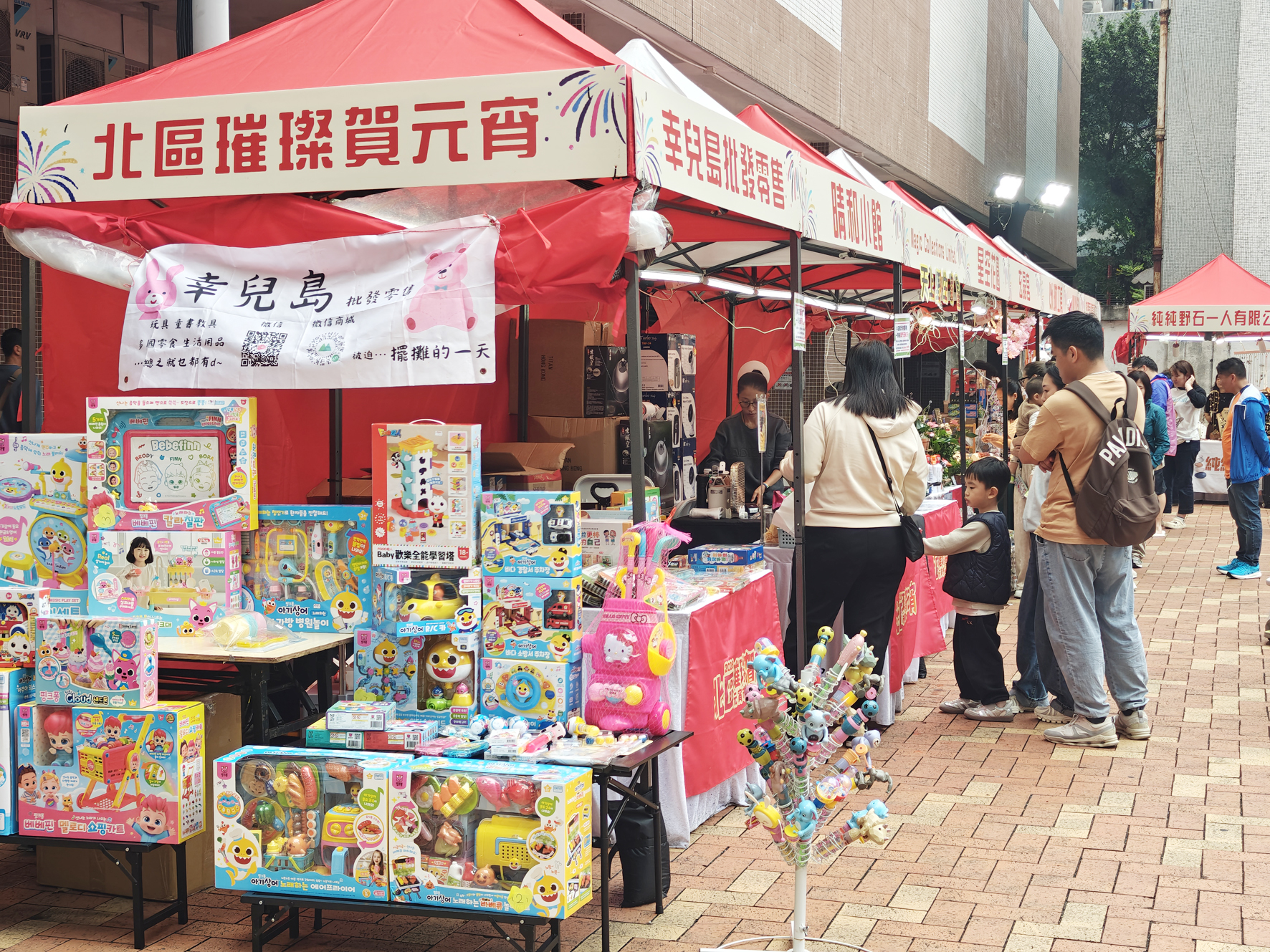市集設有逾40個攤位,涵蓋本地小吃、文創精品、飾物、節日商品等,並有多個互動遊戲攤位和打咭裝置許願樹,市民亦可參與挑戰贏取優惠券及紀念品,逢週末更有歌舞、魔術等表演助慶,為社區增添濃厚節慶氣氛。現場可見,小食攤位前排起人龍,飾品與文創攤位亦吸引不少家庭客與青年圍觀選購,粉紅色的許願樹成為打咭熱點,不少市民帶同小朋友到場玩樂品嚐美食,一家大小樂也融融。