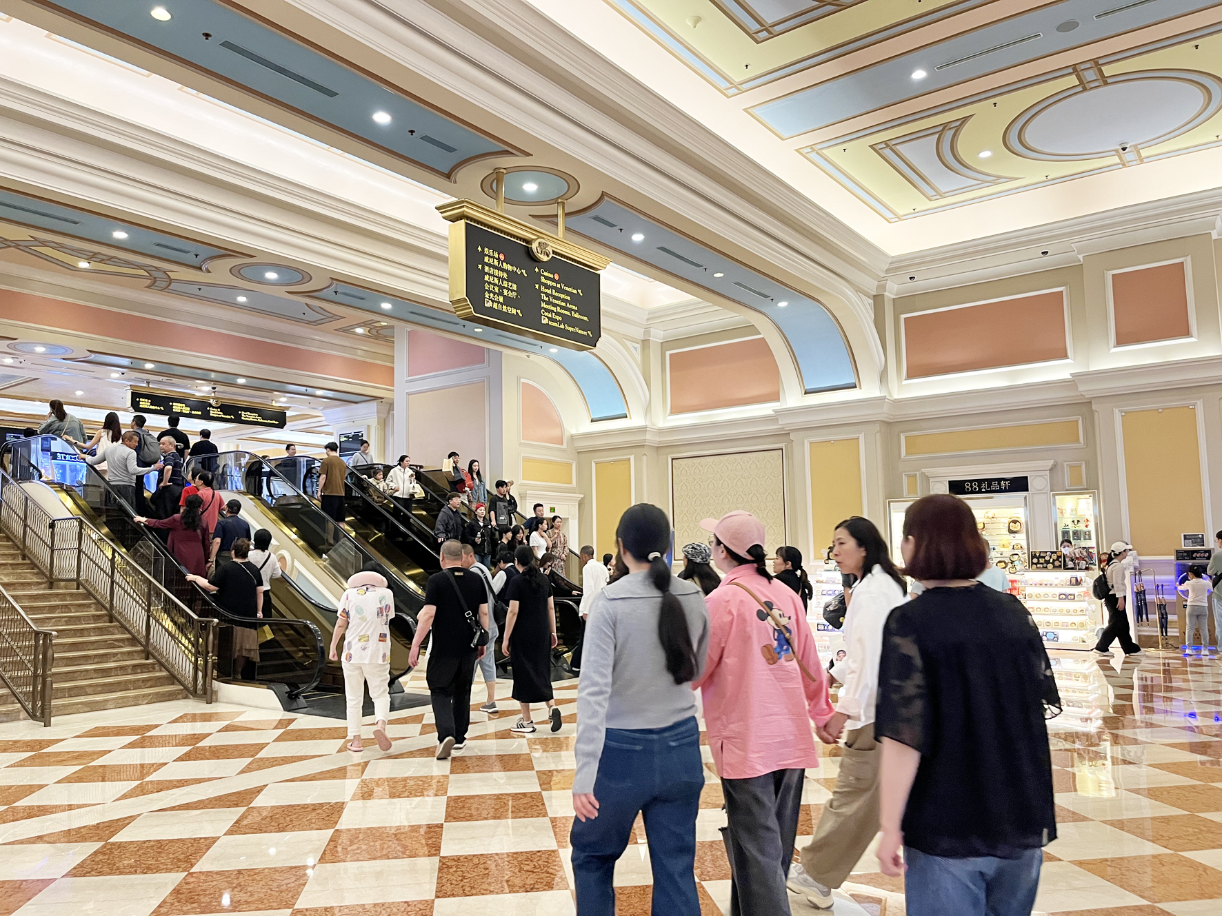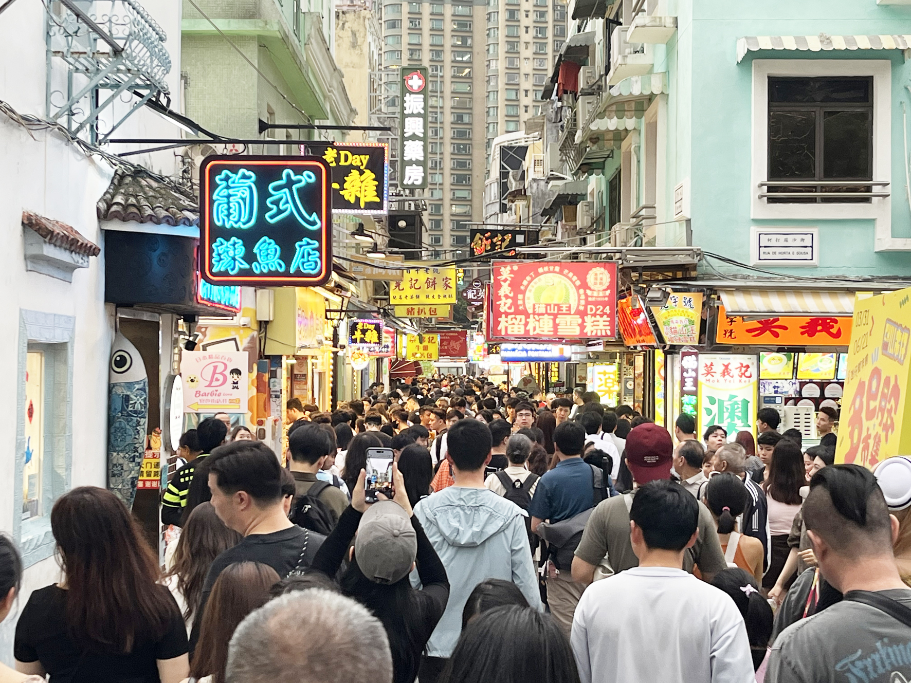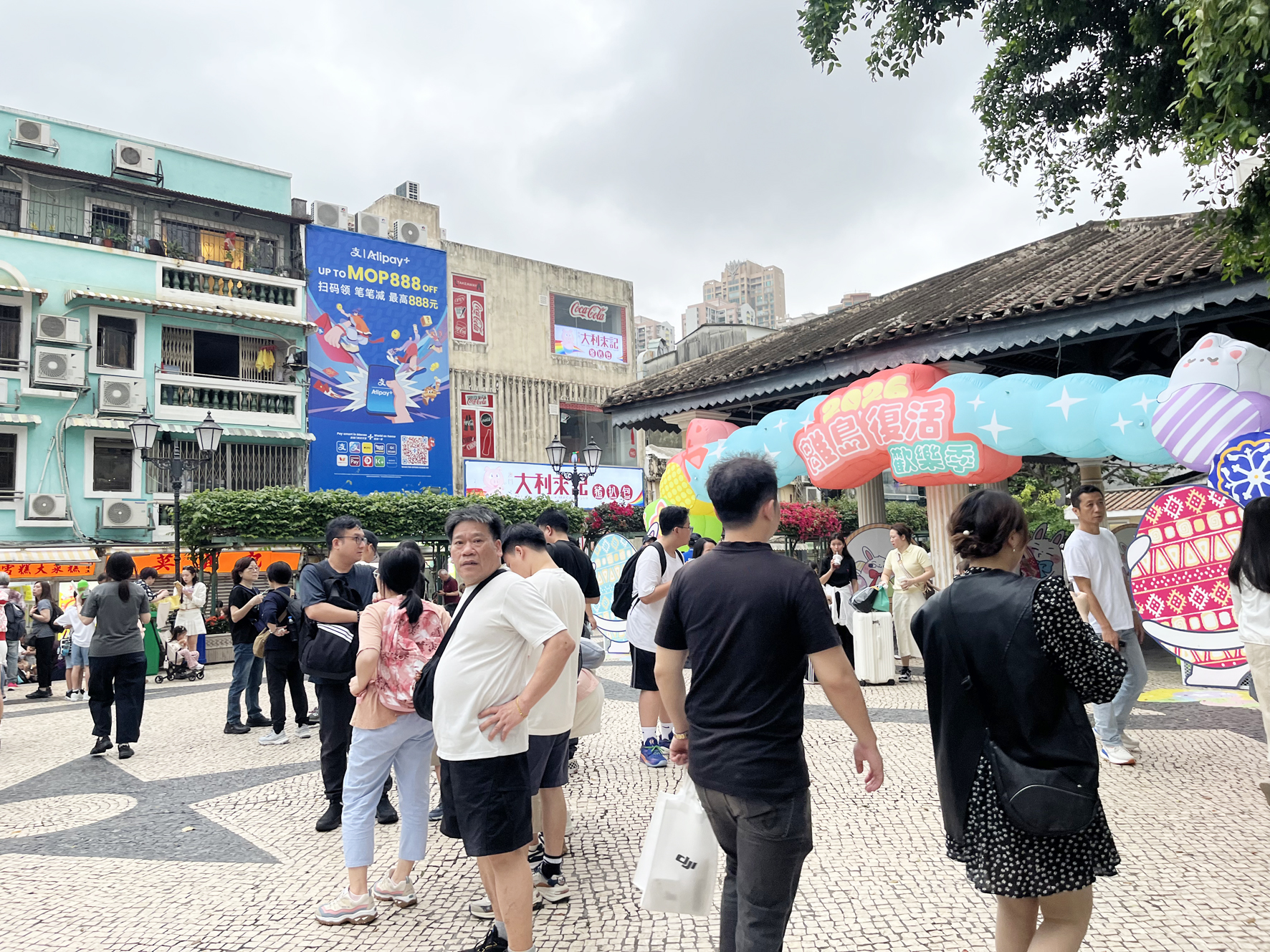 適逢清明節長假,路氹區一帶熱門景點人流不絕,尤其臨近尾聲仍見暢旺。度假村內多間設有座位的食肆座無虛席,服裝店員工忙得應接不暇,頻頻為顧客取貨試穿。氹仔舊城區同樣熱鬧,官也街、龍環葡韻博物館等周邊景點人頭攢動,手信街與美食區客流不斷,各家特色食店門外大排長龍。旅客穿梭於大街小巷,細味中西文化交融的獨特景致。